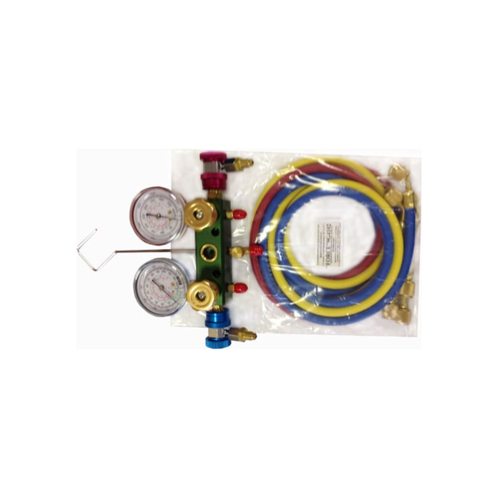 Алюминиевый блок манометров для фреона R12, R22, R134А (2 крана, 3 цветных шланга 60х1/4) FORCE 9G4102