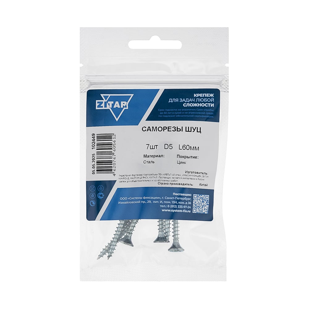 Саморез ШУц с потайной головкой 5,0x60 мм, 7 шт., пакет Zitar 102449