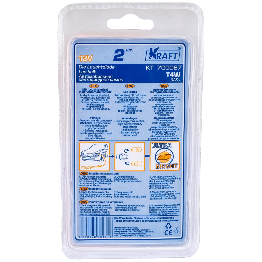 Светодиодная лампа KRAFT T4W BA9s 12v Red KT 700067