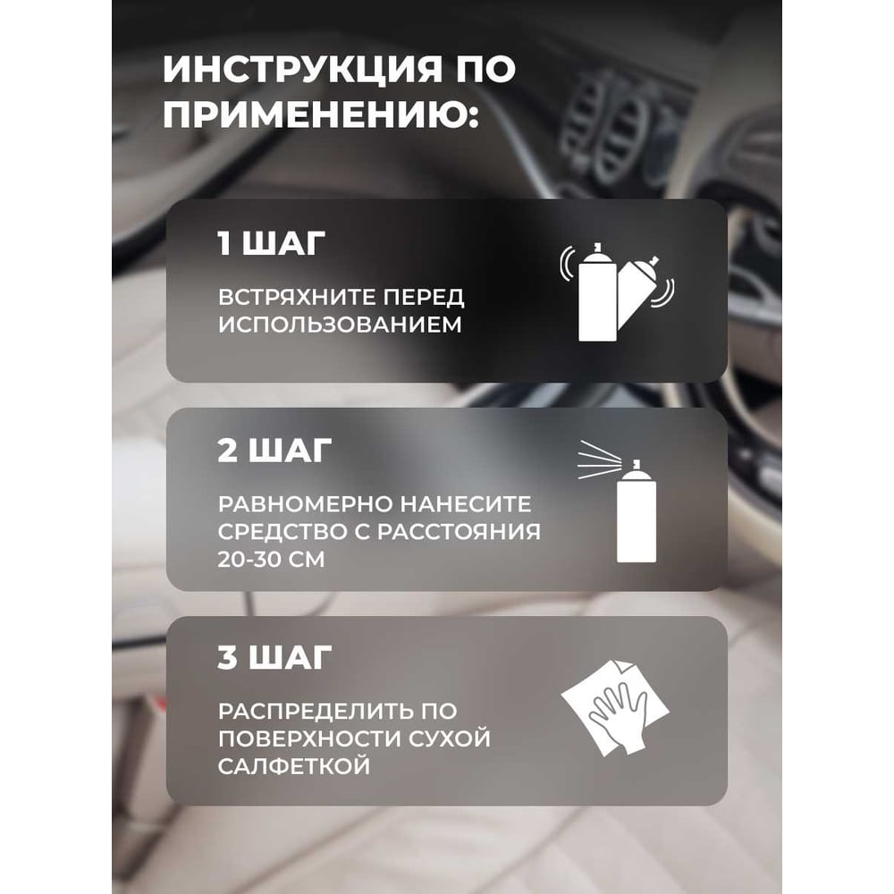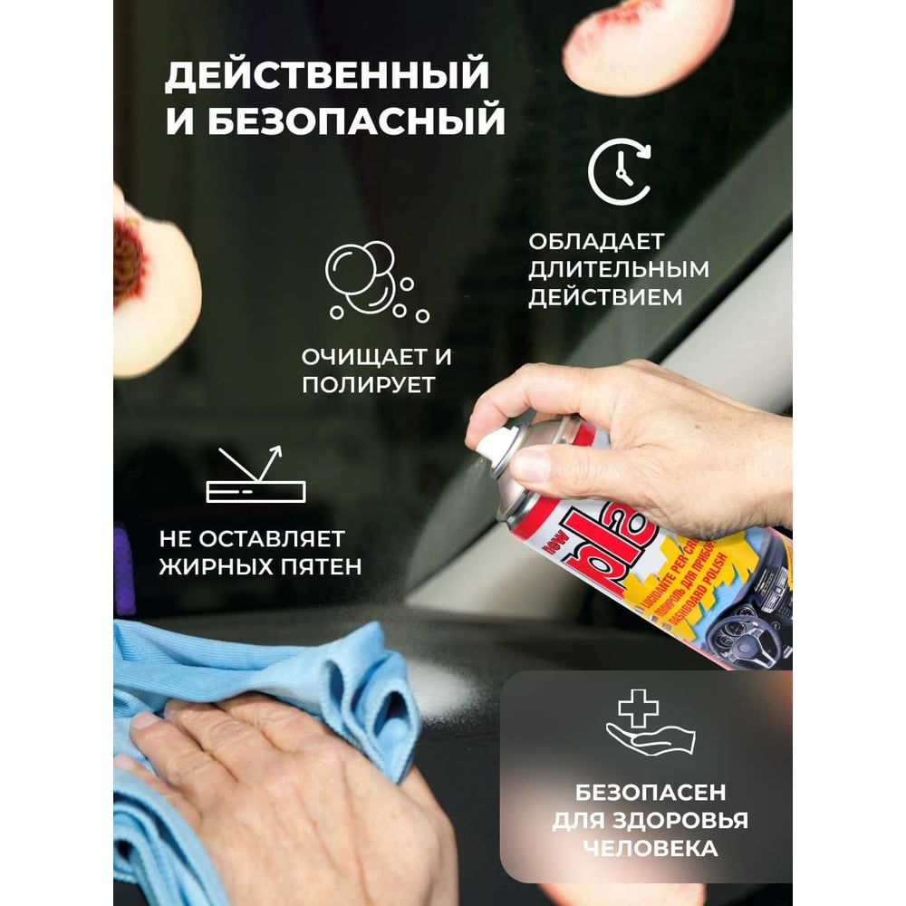 Объем 0.4 л Вид полироль Аромат персик Класс товара Бытовой Для резины/пластика да Для сплавов нет Для кожи нет Для приборной панели да Назначение для ухода за салоном Способ нанесения ручной Вид упаковки спрей/аэрозоль Вид товара аэрозоль С воском нет Степень абразивности без абразива