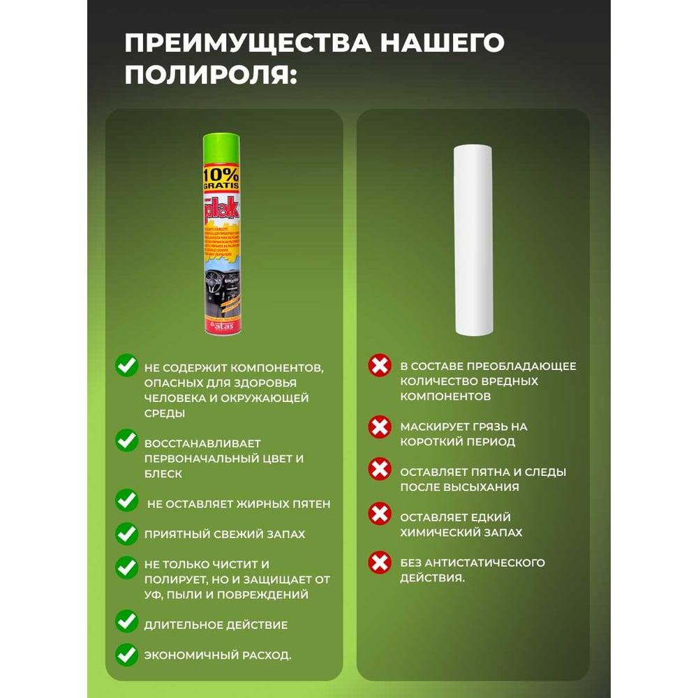 Объем 0.75 л Вид полироль Аромат зеленые холмы Класс товара Бытовой Для резины/пластика да Для сплавов да Для кожи нет Для приборной панели да Назначение для ухода за салоном Способ нанесения ручной Вид упаковки спрей/аэрозоль Вид товара аэрозоль С воском нет Степень абразивности без абразива