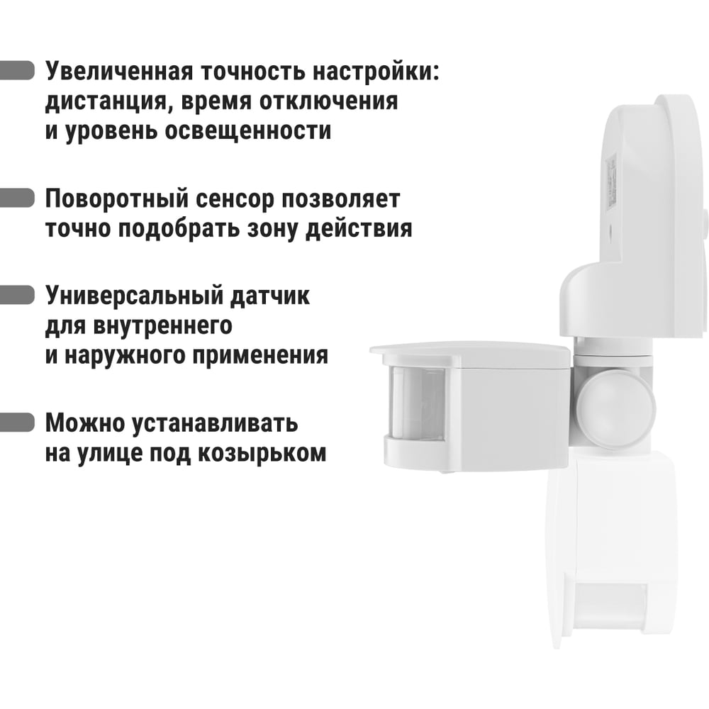 Тип установки настенный Цвет корпуса белый ГОСТ нет Напряжение 230 В Модельный ряд ДДС Монтаж накладной Уличный есть Светодиодный индикатор нет Таймер да Элементы питания сеть Рабочая температура от -20 до +45 °С Max угол обзора 180 град Степень защиты корпуса 44 IP Wi-Fi нет Max мощность нагрузки 1100 Вт Фотореле нет Звуковой сигнал нет Возможность угловой установки нет Задержка времени выключения 5 сек - 8 мин Освещенность датчика 5 - 2000 Люкс Дальность действия 12 м Рекомендуемая высота установки 1.7 м Max задержка выключения/отключения 8 мин Подключение трехпроводной Принцип действия инфракрасный Виды режимов LUX/TIME/SENS