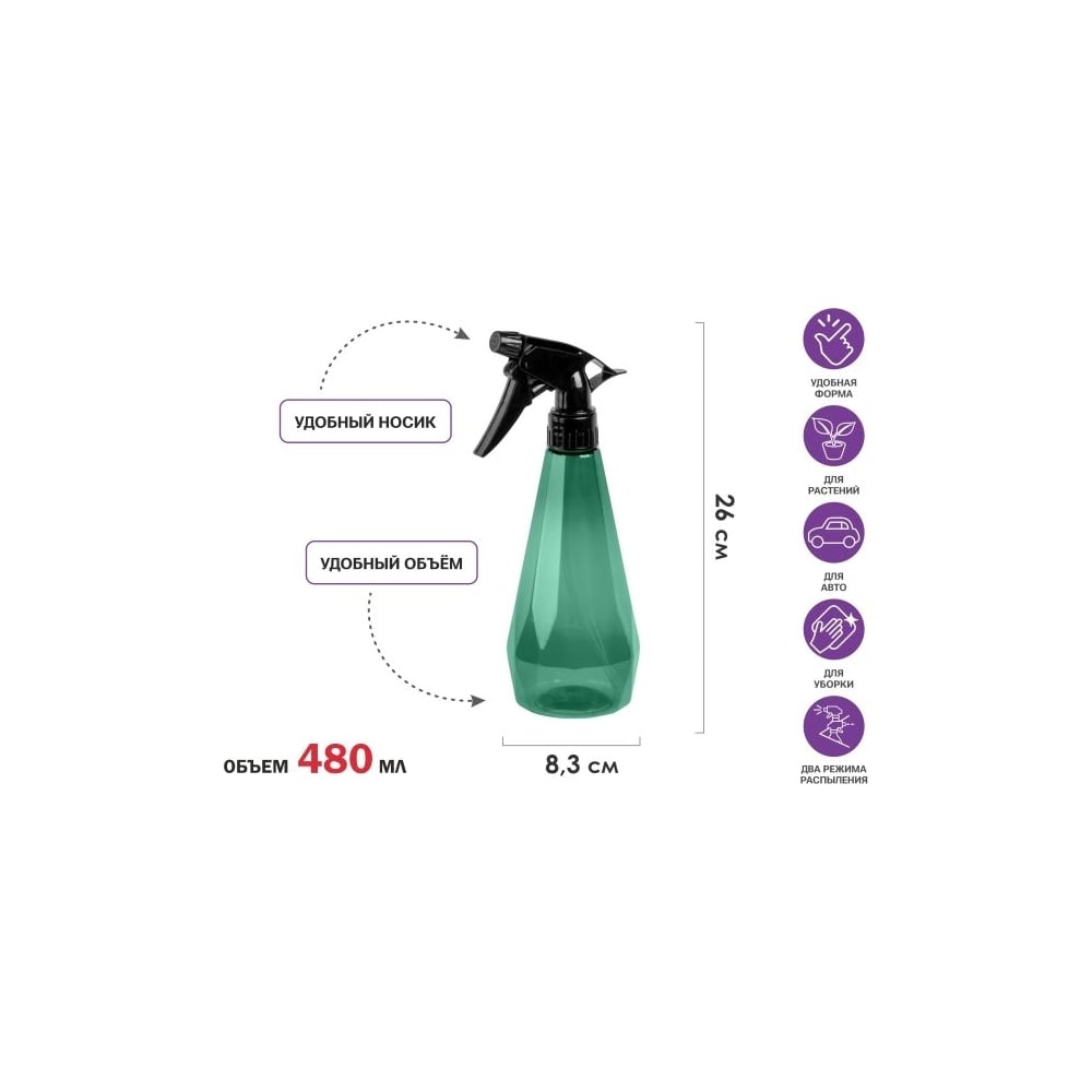 Габариты без упаковки 83х83х260 мм Материал пластик Цвет зеленый/черный Тип ручной Класс товара Бытовой Объем бака для расп.вещ 0.48 л Наличие помпы нет Длина шланга без шланга м Телескопическая штанга нет Способ переноски ручной Клапан сброса давления нет Длина штанги нет мм Регулировка распыления нет Химостойкость нет