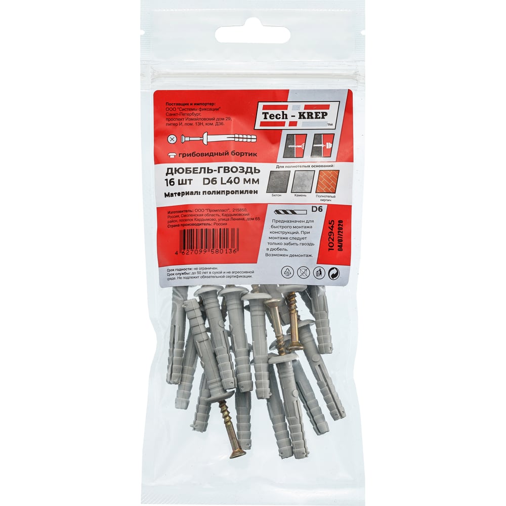 Дюбель-гвоздь Tech-Krep 6х40 грибовидная манжета, полипропилен 16 шт - пакет 102945