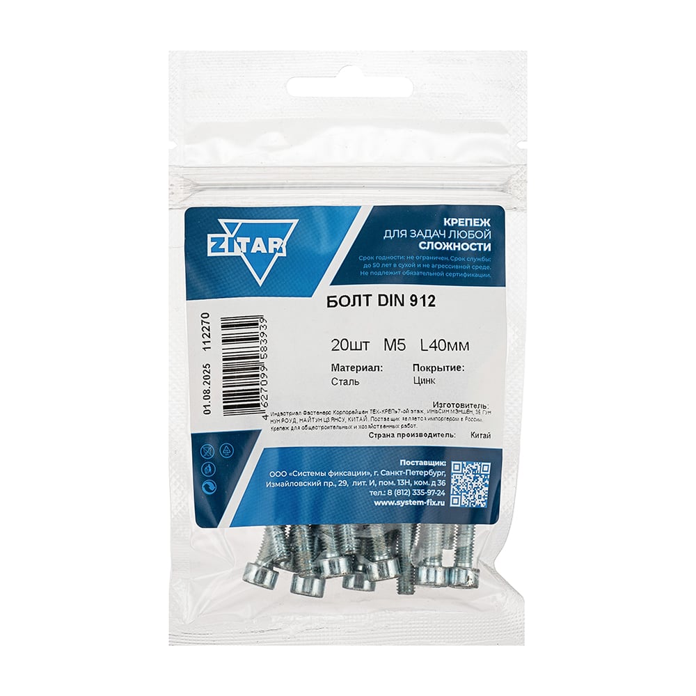 Болт с цилиндрической головкой и внутренним шестигранником DIN912 5x40 мм, 20 шт в пакете Zitar 112270