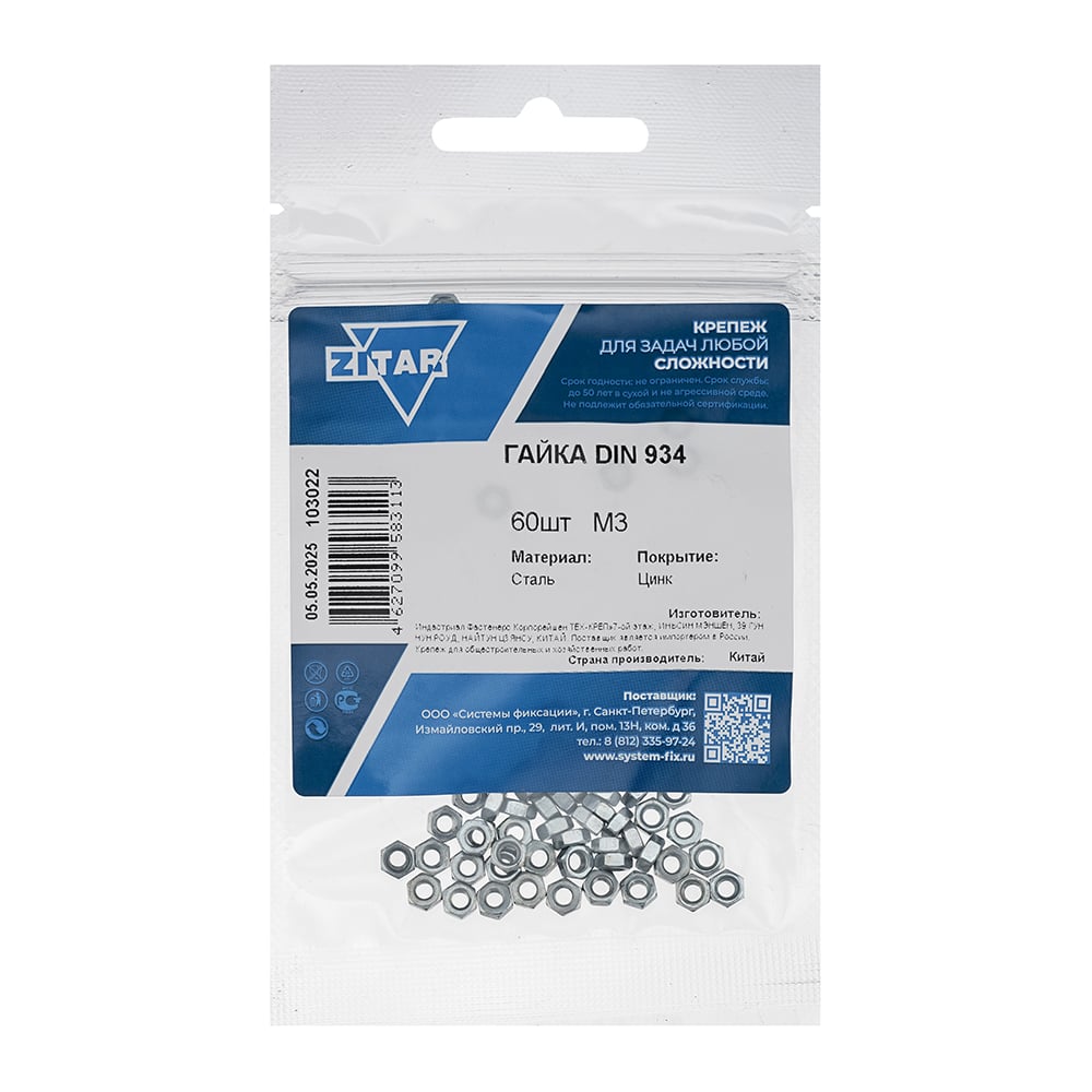 Гайка DIN934 шестигранная оцинкованный М3 60 шт Zitar 103022