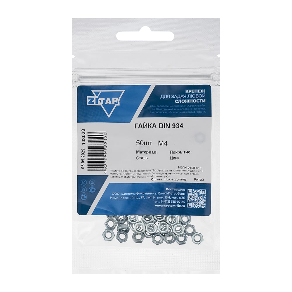 Гайка DIN934 шестигранная оцинкованный М4 50 шт Zitar 103023