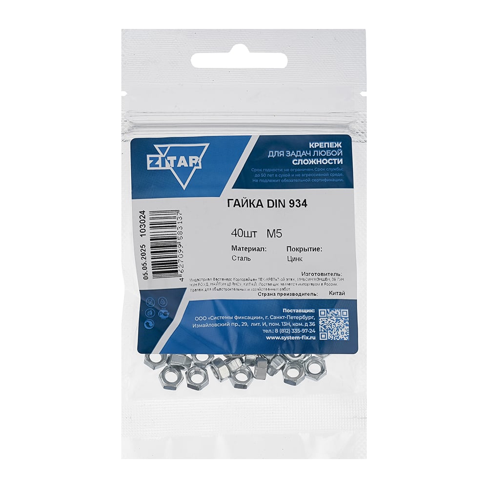 Гайка DIN934 шестигранная оцинкованный М5 40 шт Zitar 103024