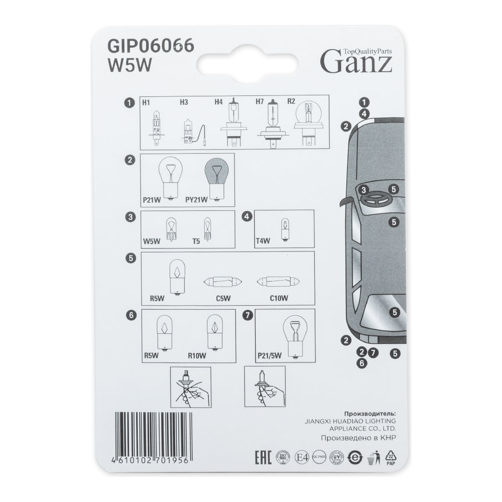 Лампа GANZ 24V W5W 5W W2,1x9,5d 2 шт. блистер GIP06066