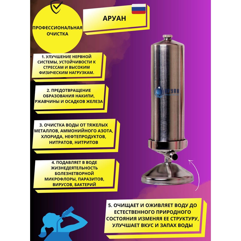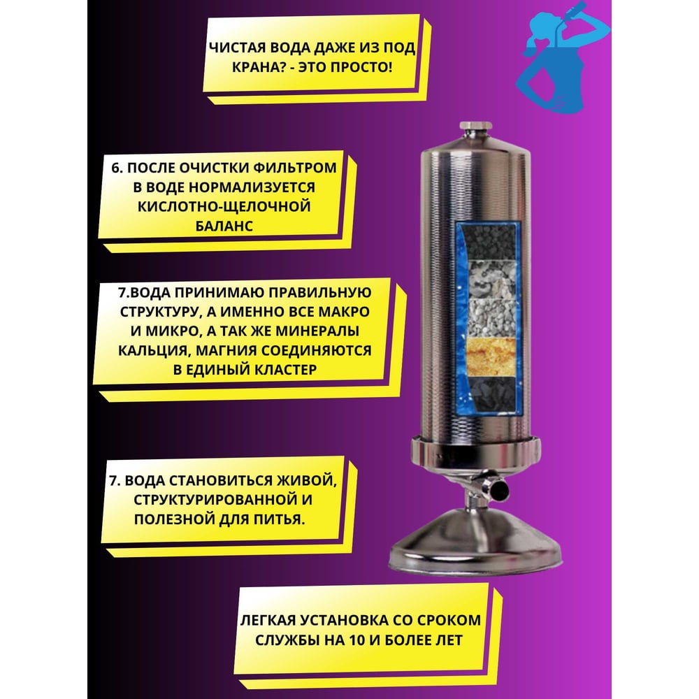| Фильтрация от | бактерий, тяжелых металлов, радиоактивных веществ, химических веществ, примесей, солей жесткости |