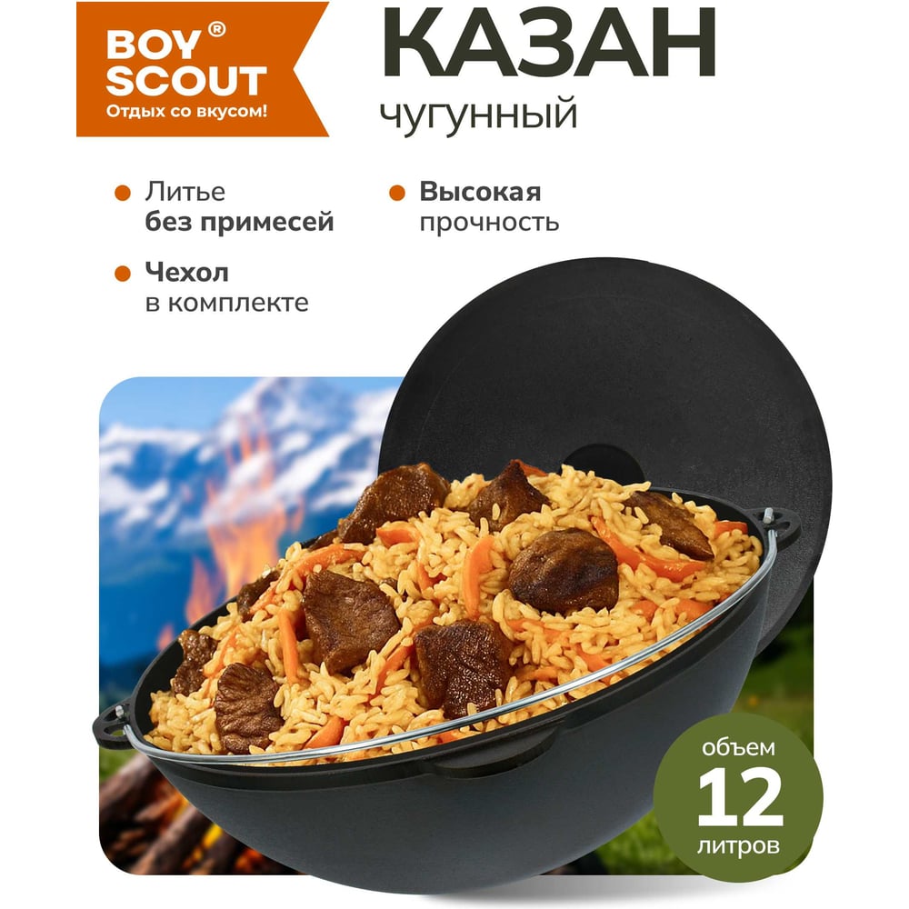 Казан чугунный с крышкой и дужкой BOYSCOUT 12 л, в чехле, азиатская чаша 61623