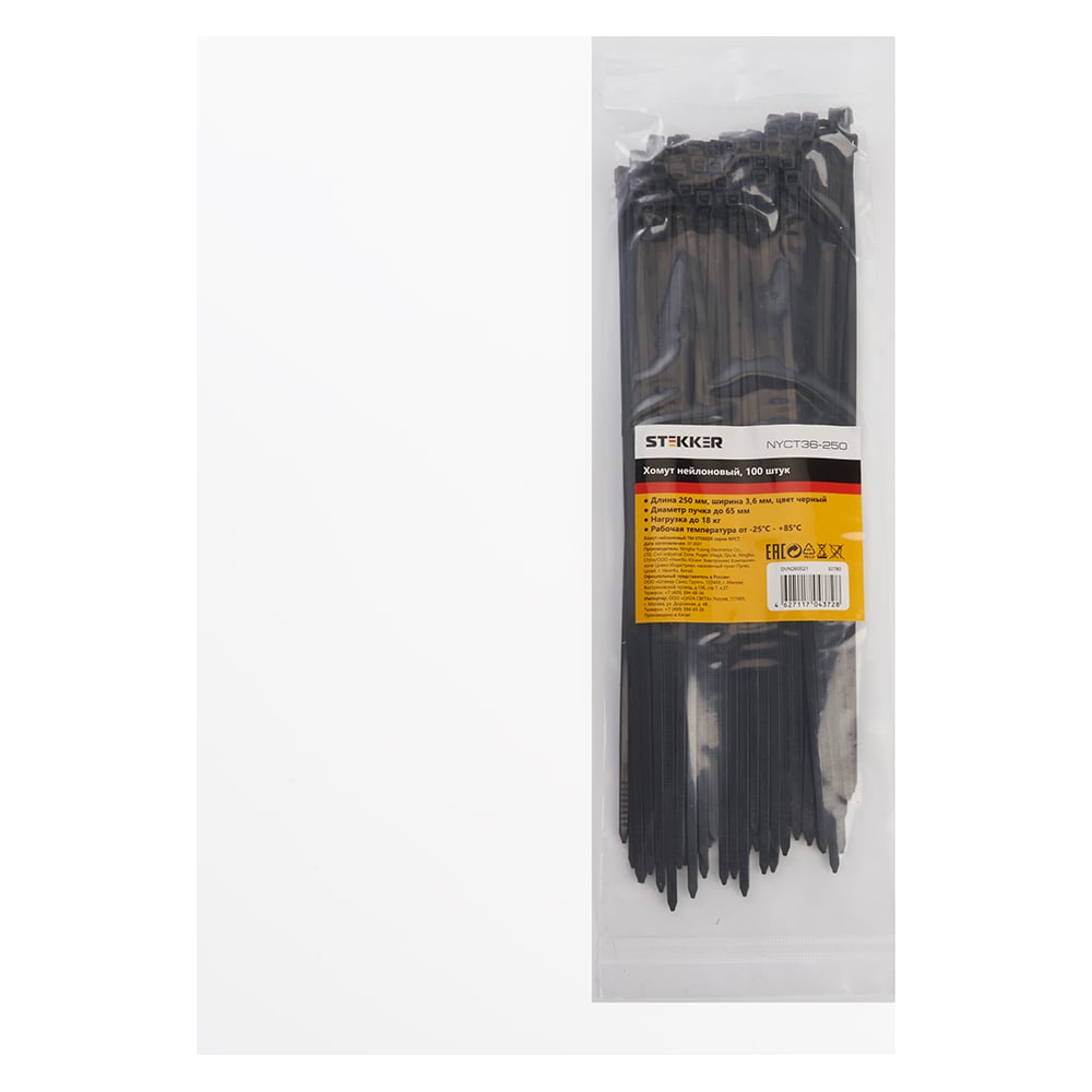 Хомут STEKKER NYCT36-250 нейлоновый 3.6x250 мм, 65 мм, нагрузка 18 кг, черный, 100 шт в упак 32780