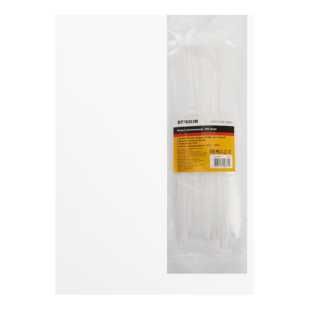 Нейлоновый хомут STEKKER 3,6x250 мм, белый, NYCT36-250 100шт в упак 32779