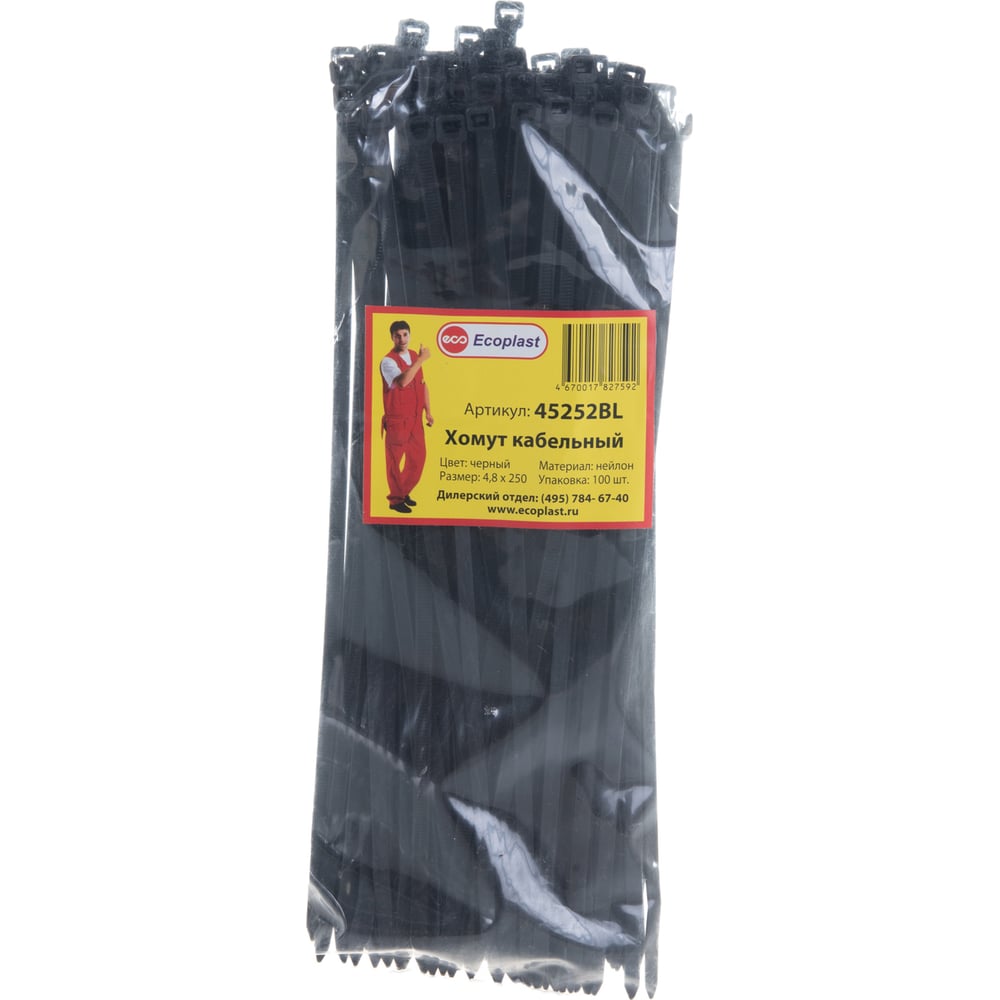 Экопласт хомуты кабельный 4,8 х 250мм, цвет черный, 100шт 45252bl