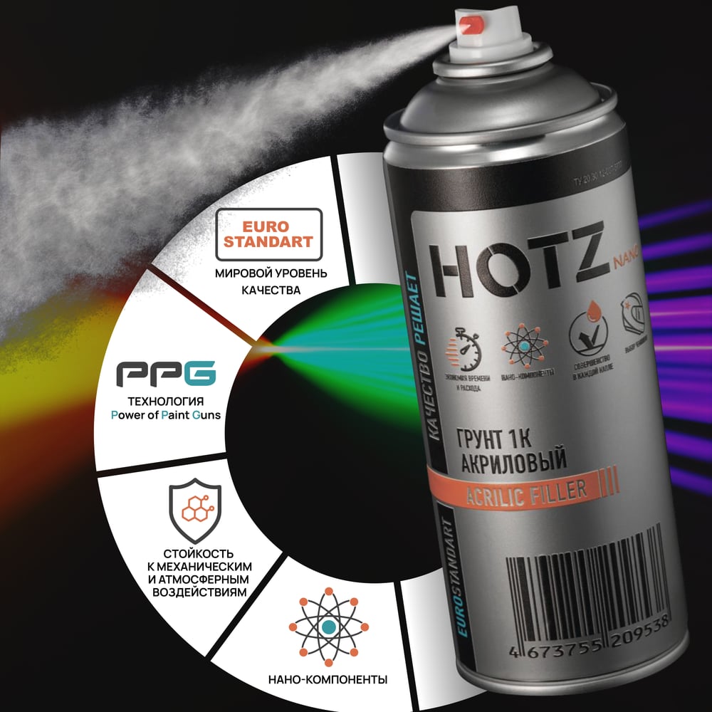 Грунтовка HOTZ 1К ГРУНТ ВЫРАВНИВАЮЩИЙ, Серый, быстросохнущий, акриловый. Профессиональный аэрозоль, 520 мл 4673755209538