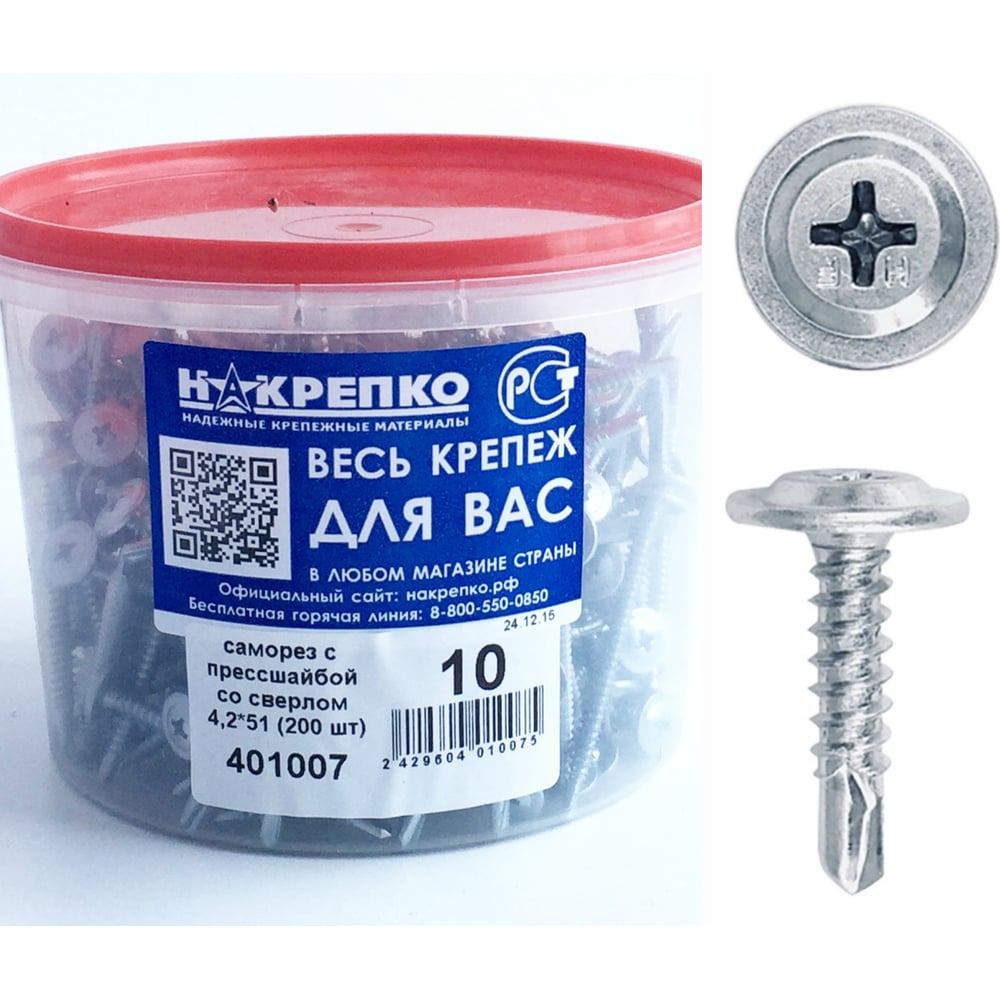 Саморез НАКРЕПКО с прессшайбой, со сверлом, 4,2х51, 200 шт. 401007