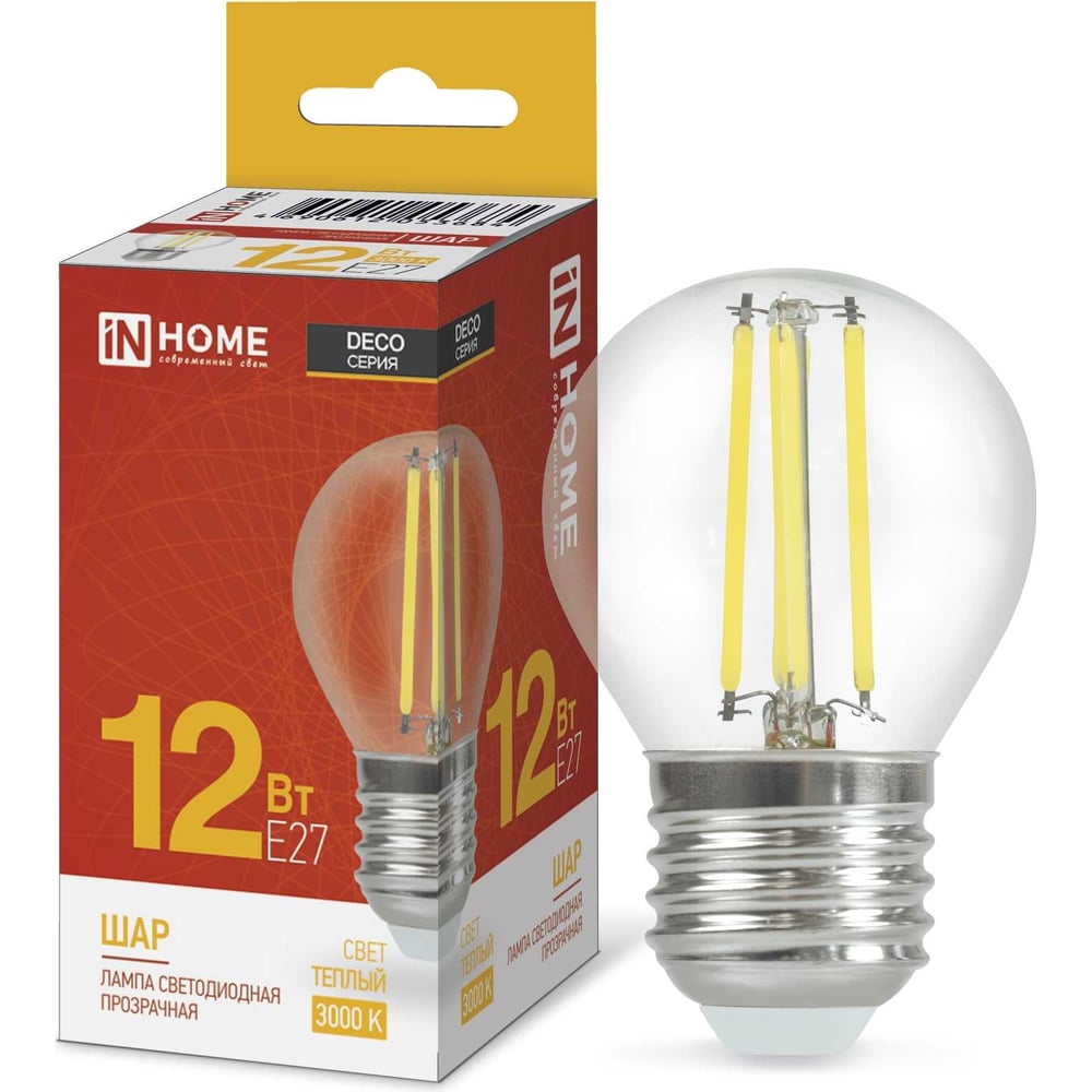 Лампа IN HOME сд LED-ШАР-deco 12Вт 230В Е27 3000К 1350Лм прозрачная 4690612053684