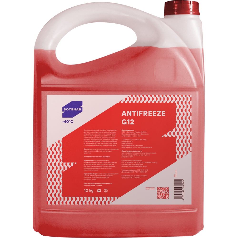 Антифриз SotSnab для двигателя автомобиля Антифриз G12 (красный), 10 кг, 10л, (-40), охлаждающая жидкость СотСнаб АНТG12кр-30.10