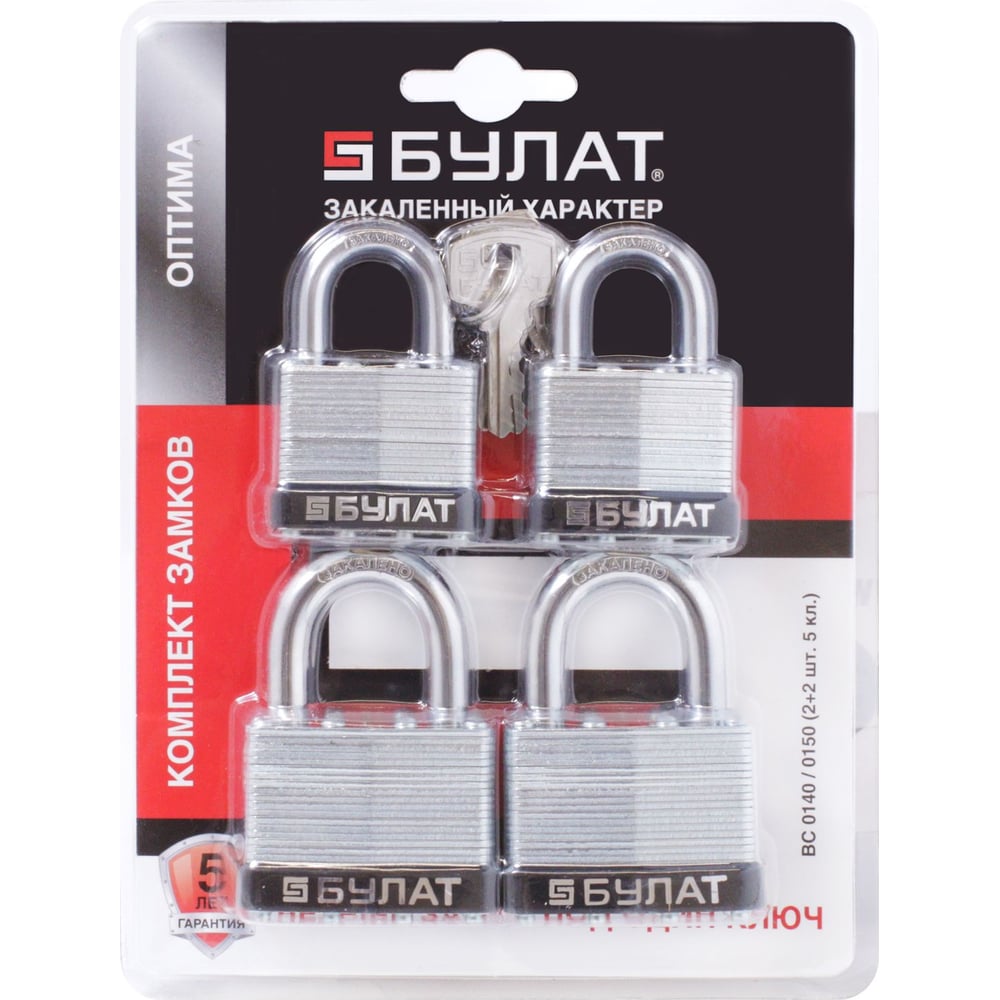 Замок навесной БУЛАТ ВС 0140/0150 ПЛ под один ключ, компл. - 4 шт., 5 кл., d=6/9 мм 16515