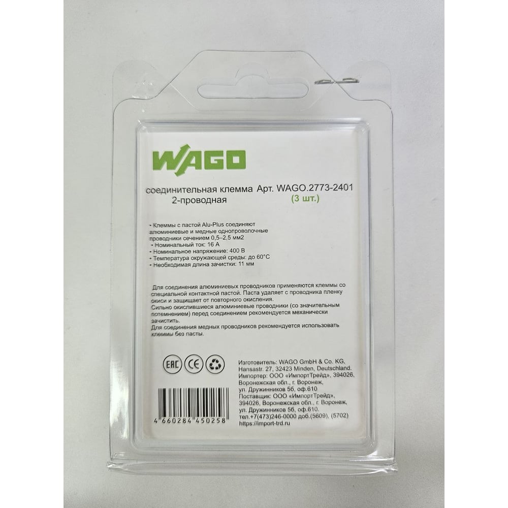 Клемма соединительная для сращивания проводов WAGO 2773-2401 3шт WAGO.2773-2401-3