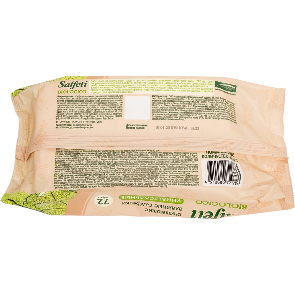 Влажные биоразлагаемые салфетки SALFETI ECO BIOLOGICO 72178