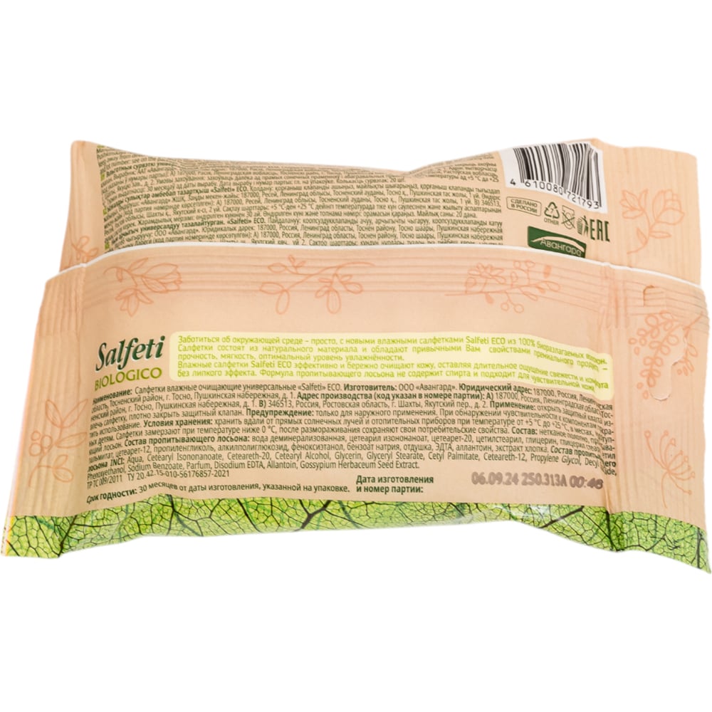 Влажные биоразлагаемые салфетки SALFETI ECO BIOLOGICO 72179