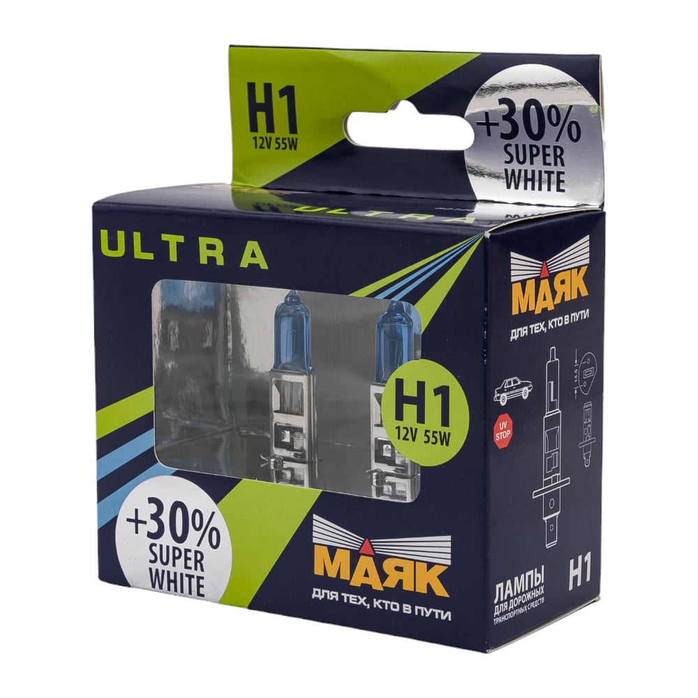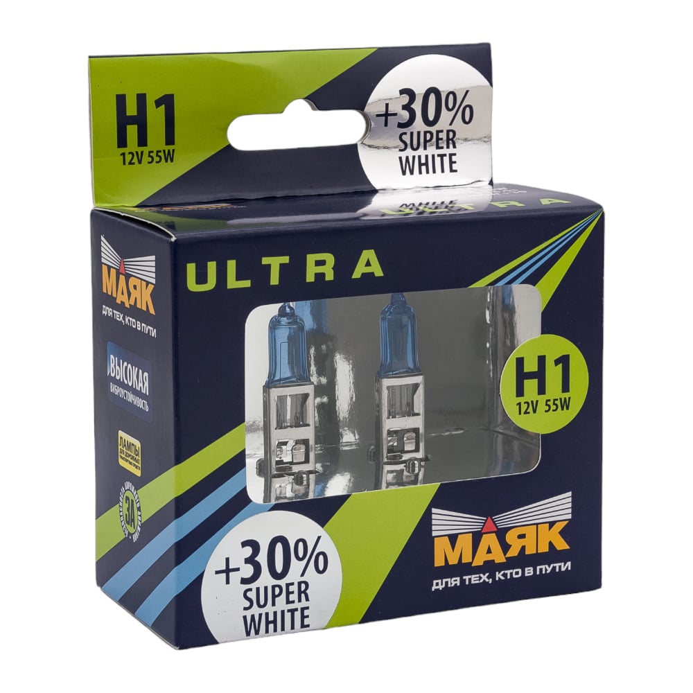 Автомобильная галогенная лампа МАЯК H1, 12V, 55W, P14,5s Super White +30% ULTRA, 2 шт. 82120SW+30