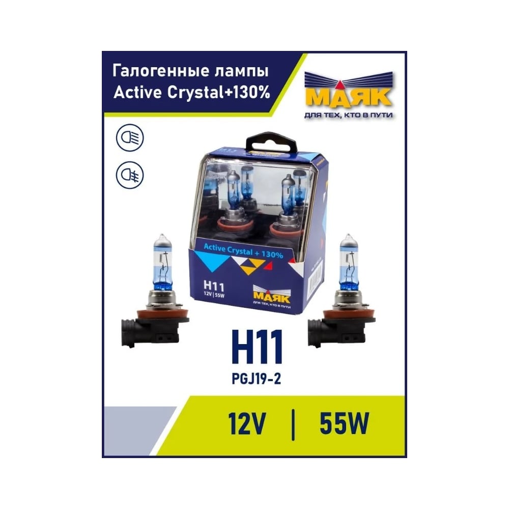 Автомобильная галогенная лампа МАЯК H11, 12 В, 55 Вт, PGJ19-2, Active Crystal +130, 2 шт. 72110AC+130