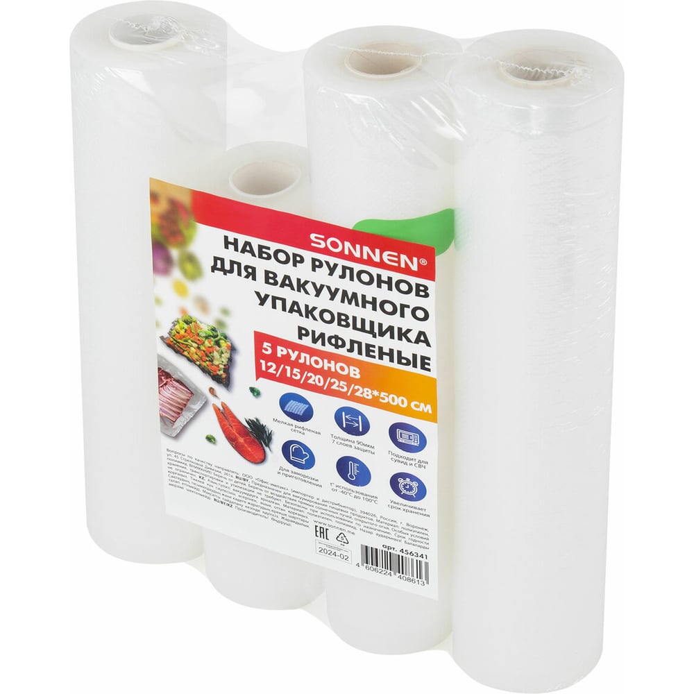 Рулоны для вакуумного упаковщика SONNEN рифленые, НАБОР 5шт, (12/15/20/25/28смx500см) 456341