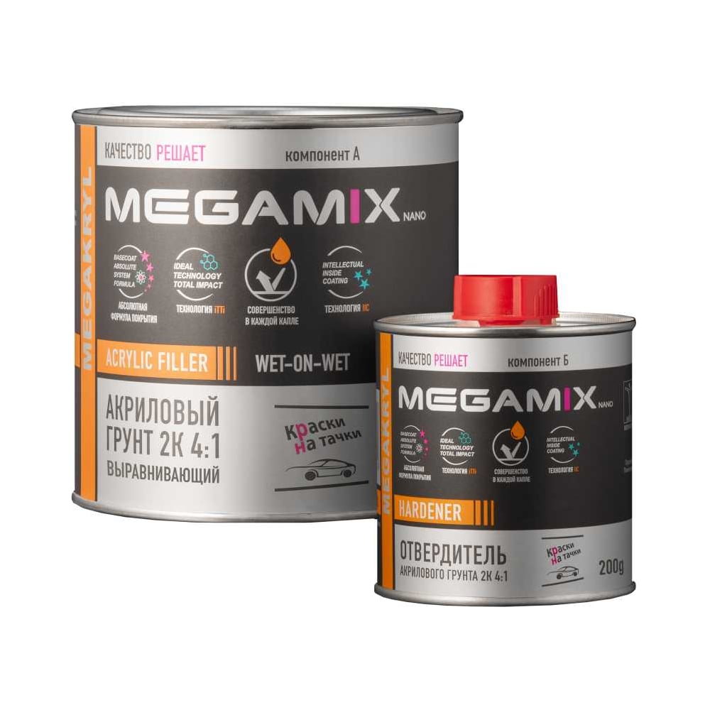 Грунт автомобильный акриловый Megamix 2К выравнивающий 4:1 светло-серый, комплект (грунт: 800 г + отвердитель: 200 г) 4673755229307