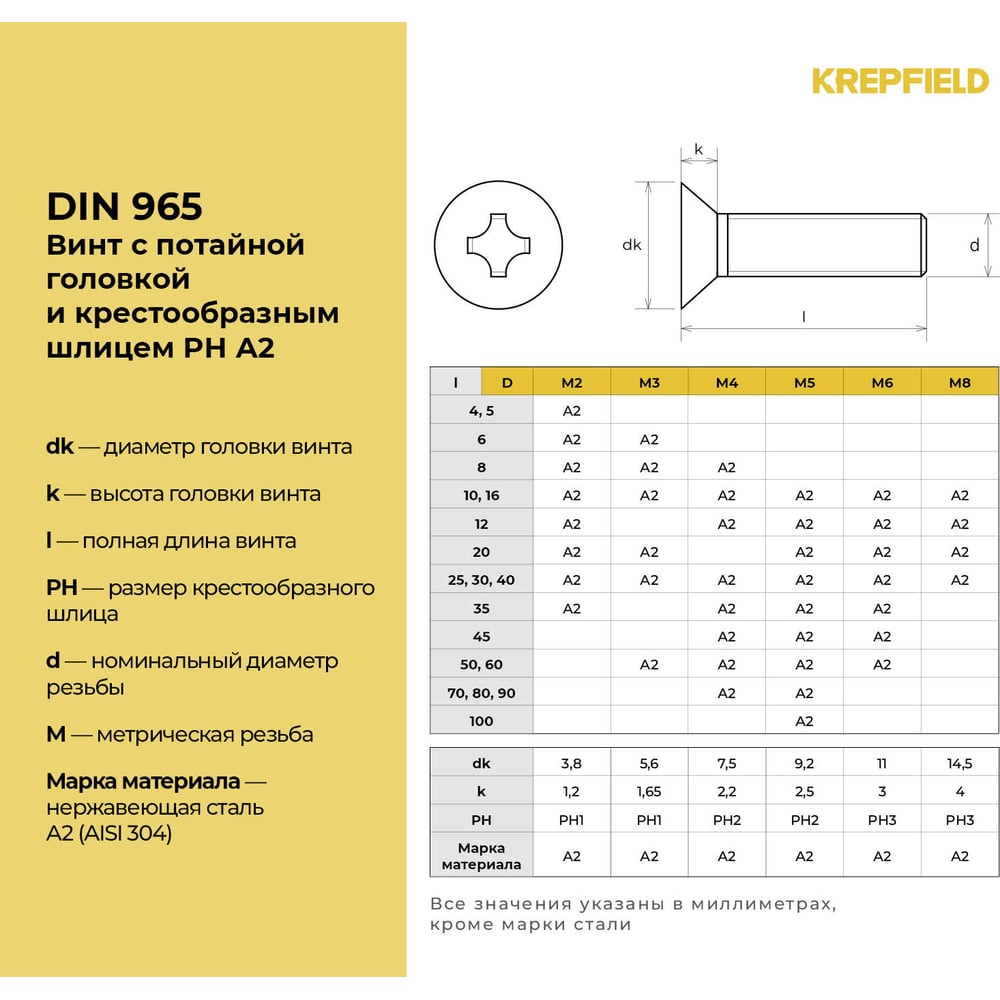 Нержавеющий винт с потайной головкой KREPFIELD M5x12 мм, DIN 965, А2, крестообразный шлиц PH, 50 шт. 965А2ВИНТ5Х12-50