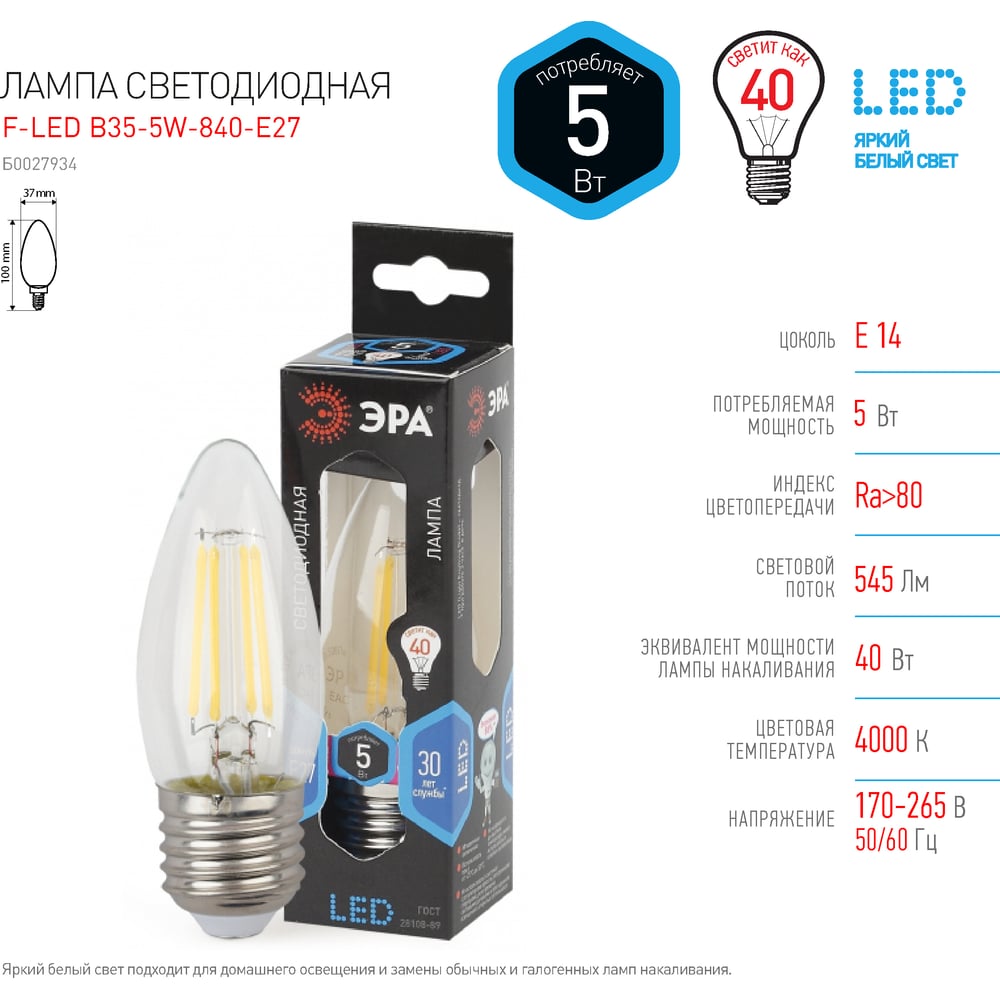 Светодиодная лампа ЭРА F-LED B35-5W-840-E27 Б0027934