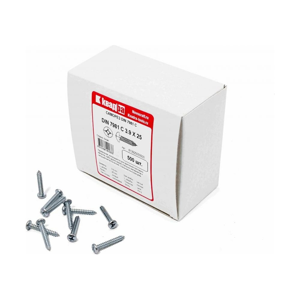 Саморез Квадра DIN 7981 3.9x25 цинк, кор. 500 шт., полусфера, шлиц PH2, острый 813925050500