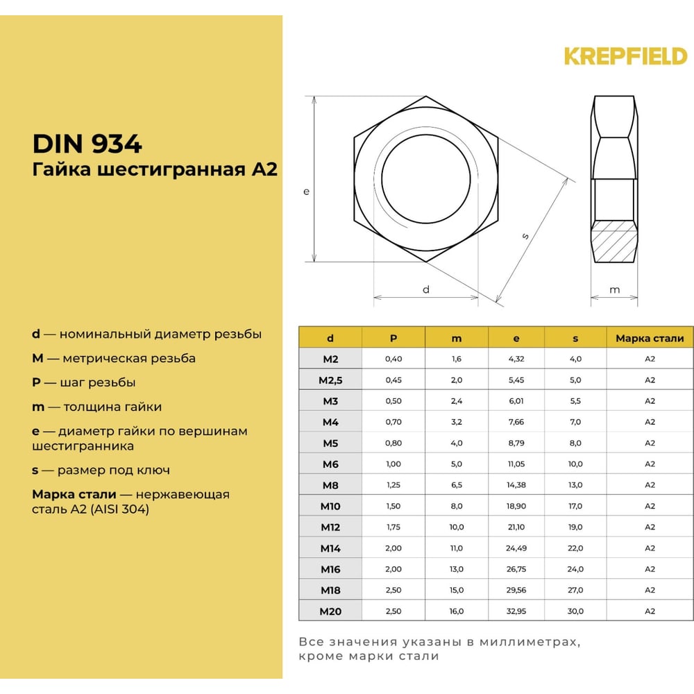 Шестигранная нержавеющая гайка KREPFIELD М5, DIN 934, 500 шт. 934А2ГАЙКАМ5-500