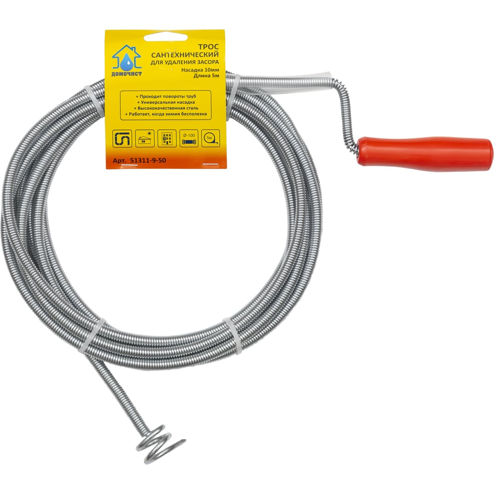Сантехнический трос для удаления засоров в трубах диаметром до 100 мм Домочист 51311-9-50