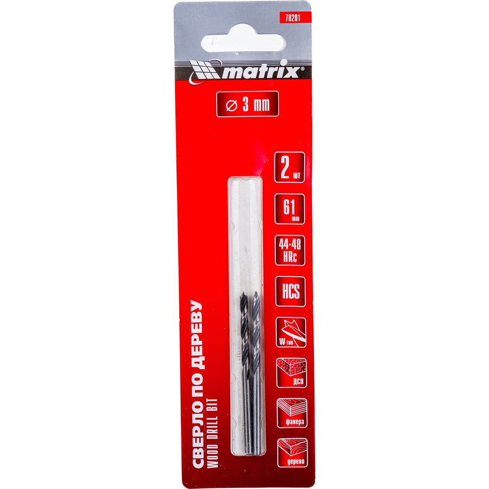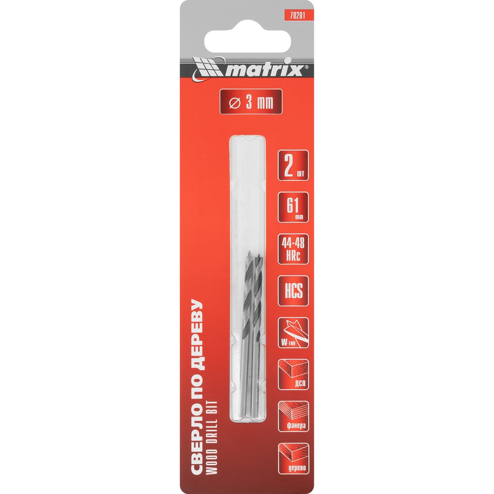 Сверло по дереву (2 шт; 3x60х33 мм; цилиндрический хвостовик) MATRIX 70201