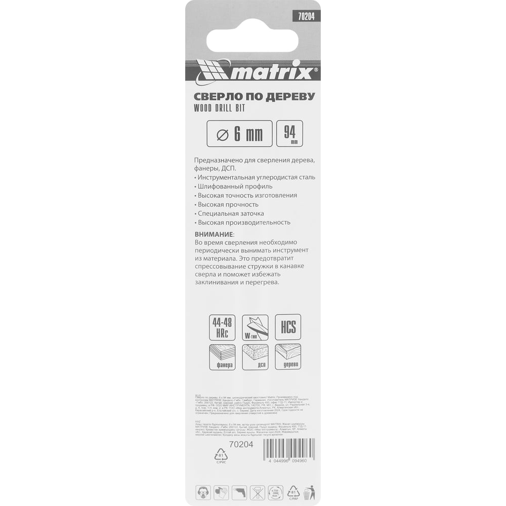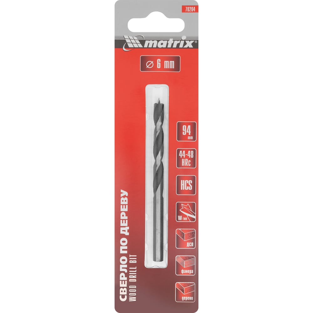 Сверло по дереву (6x90х57 мм; цилиндрический хвостовик) MATRIX 70204