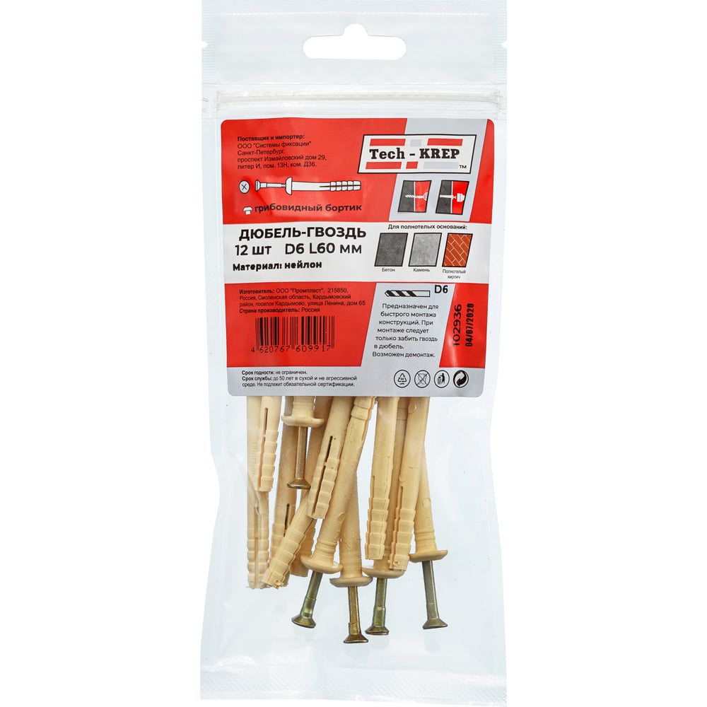 Дюбель-гвоздь Tech-Krep 6х60 грибовидная манжета, нейлон 12 шт - пакет 102939