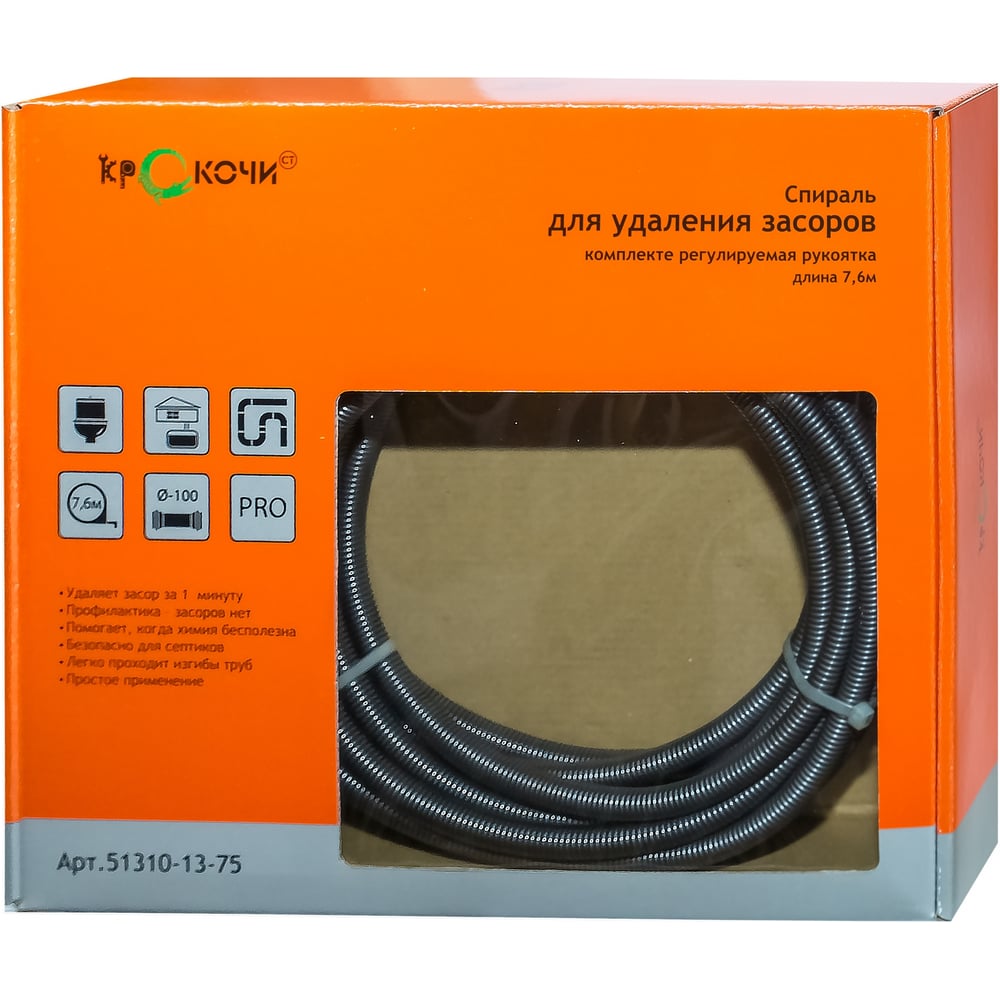 Спираль с универсальной насадкой для удаления засоров (в трубах Ф до 150 мм, длиной до 15 метров) КРОКОЧИСТ 51310-13-15