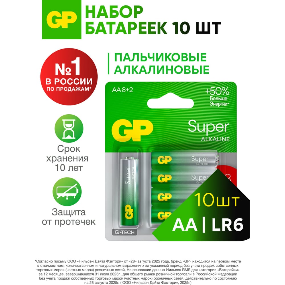 Алкалиновые батарейки GP Super Alkaline G-Tech АA, набор 10 шт. 8+2 15A8/2-CR10 15783864
