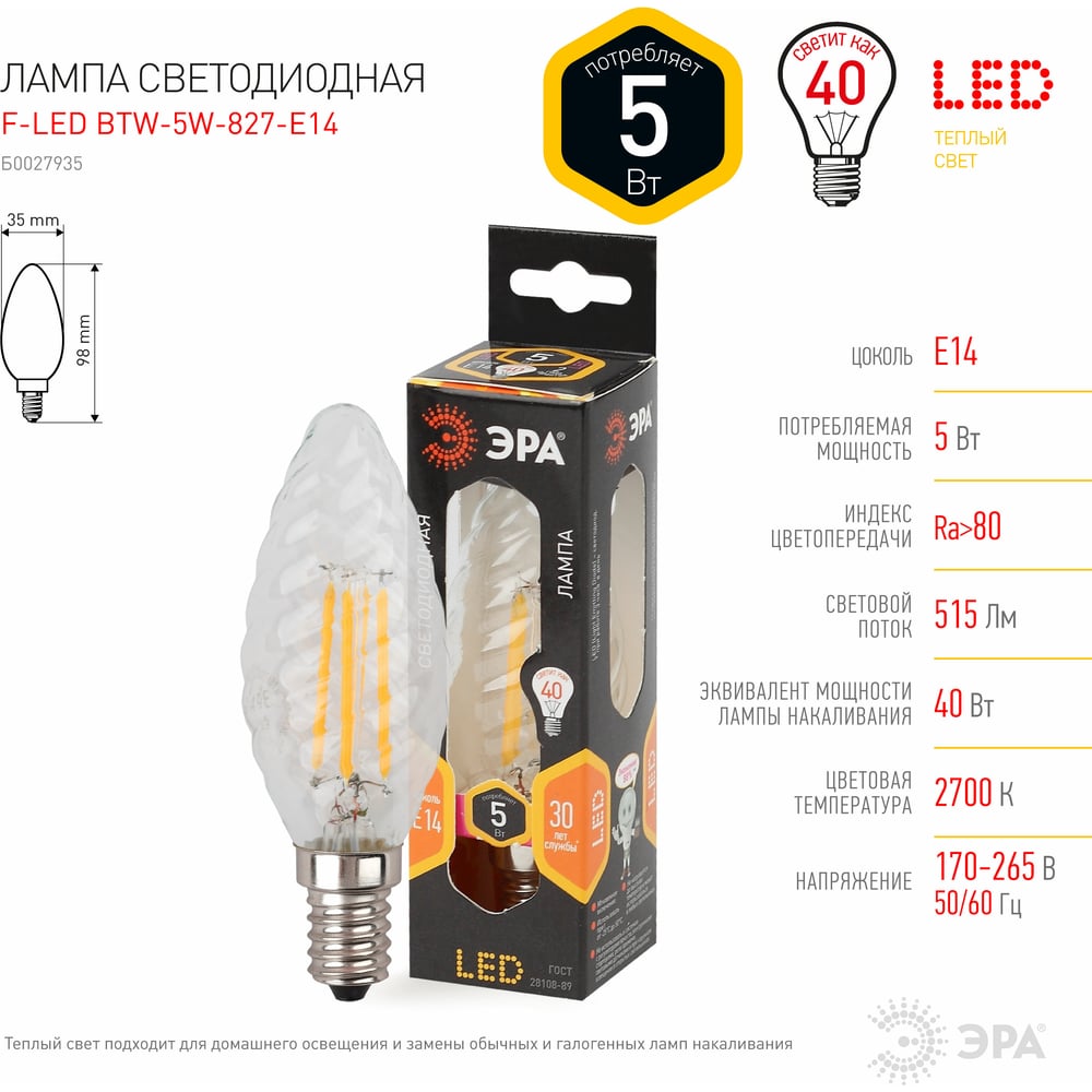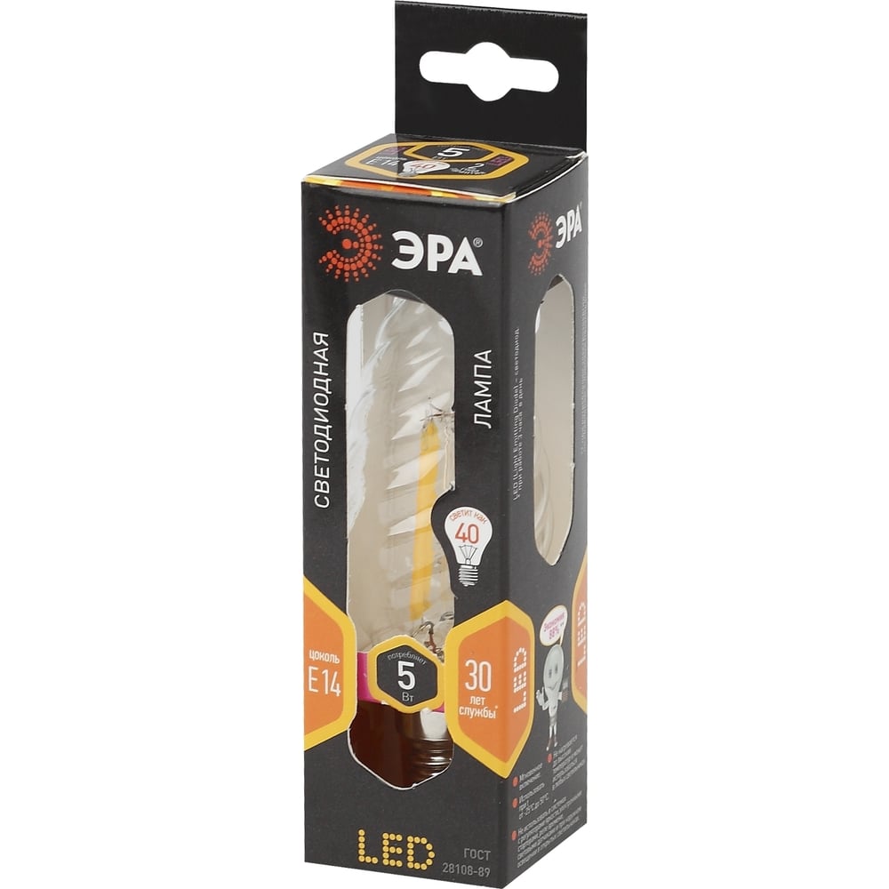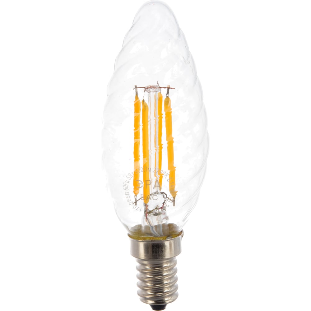 Светодиодная лампа ЭРА F-LED BTW-5W-827-E14 филамент, свеча витая, теплый Б0027935