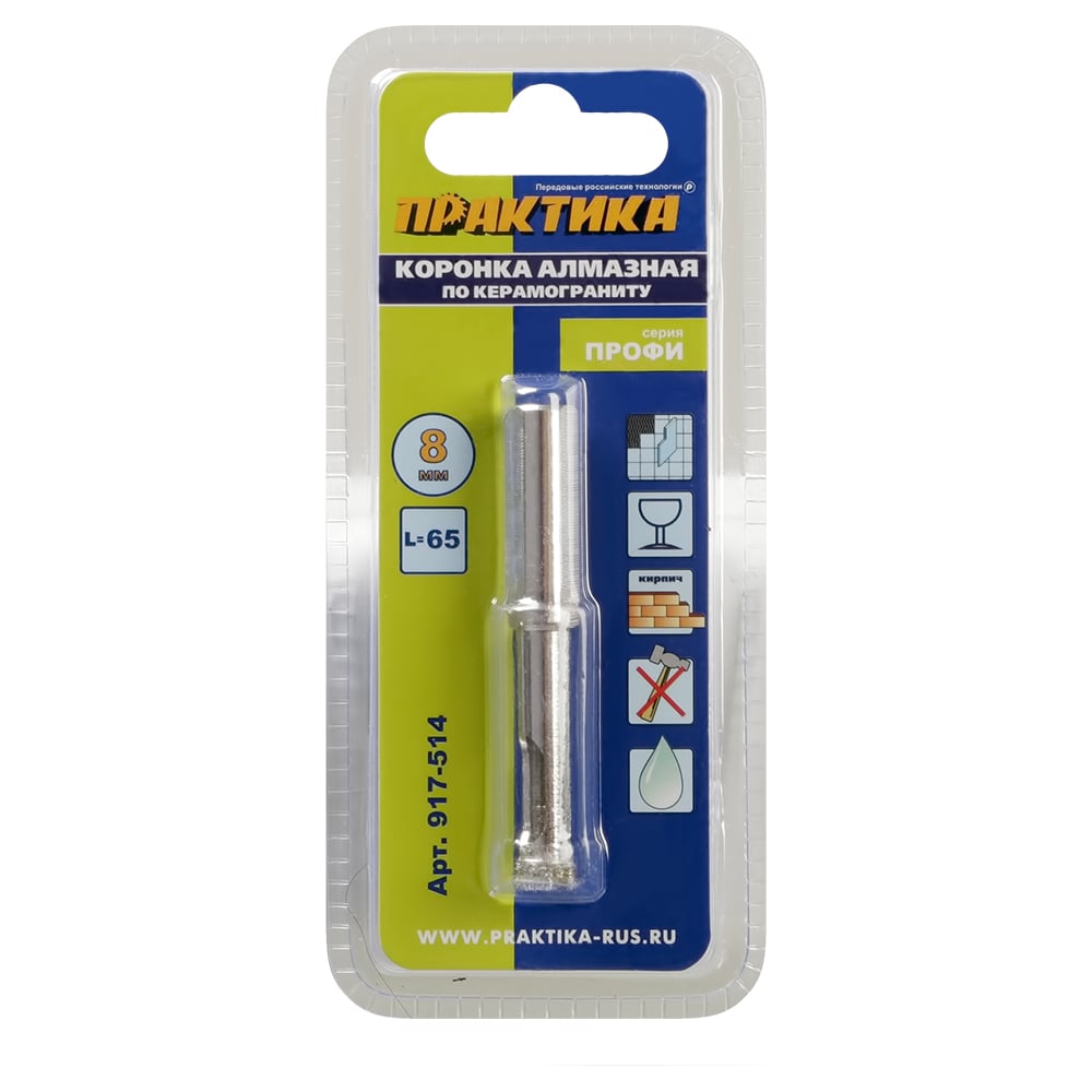 Коронка алмазная по керамограниту/керамике Профи (8х65 мм) ПРАКТИКА 917-514
