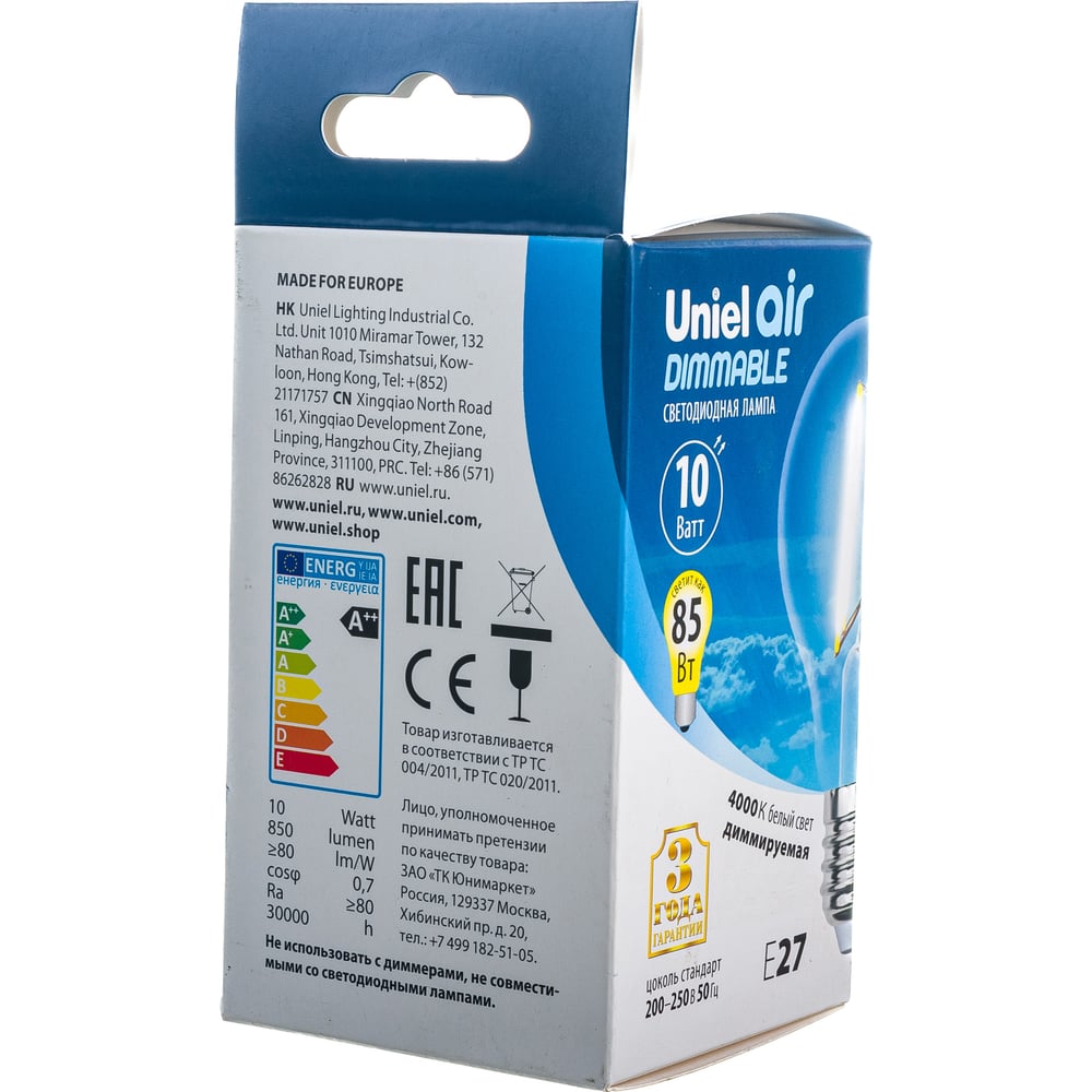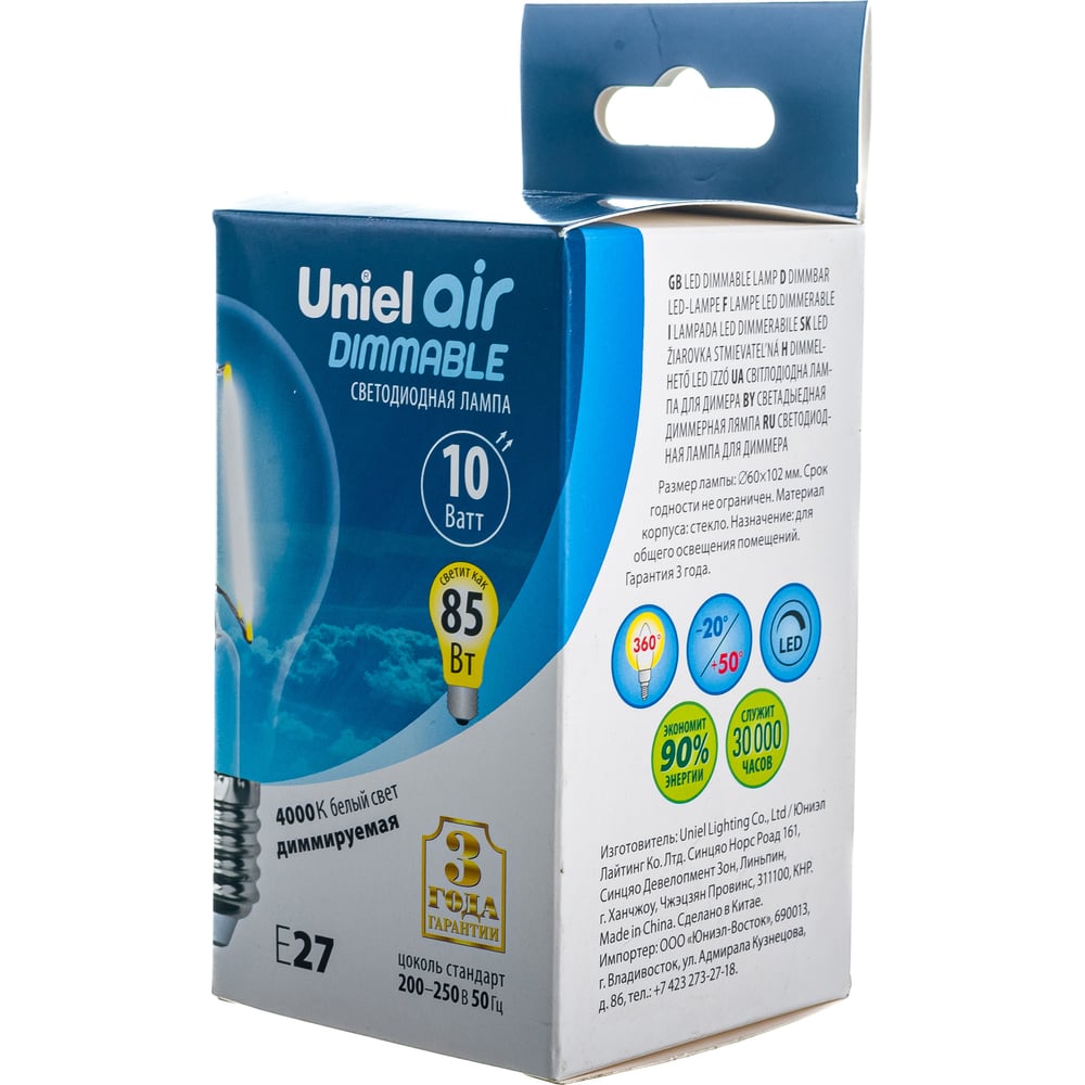 Светодиодная лампа Uniel Форма А Серия диммируемая Air LED-A60-10W/4000K/E27/CL/DIM UL-00005182