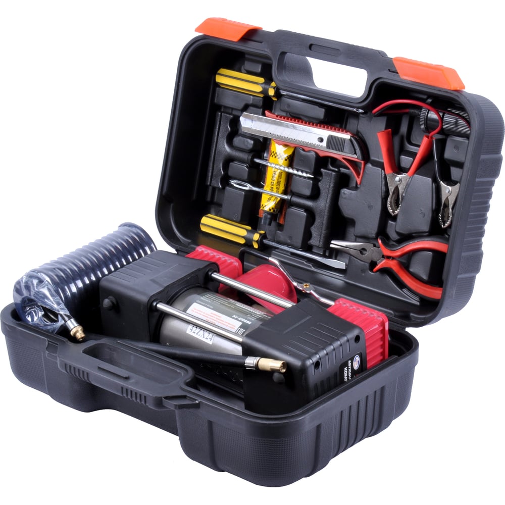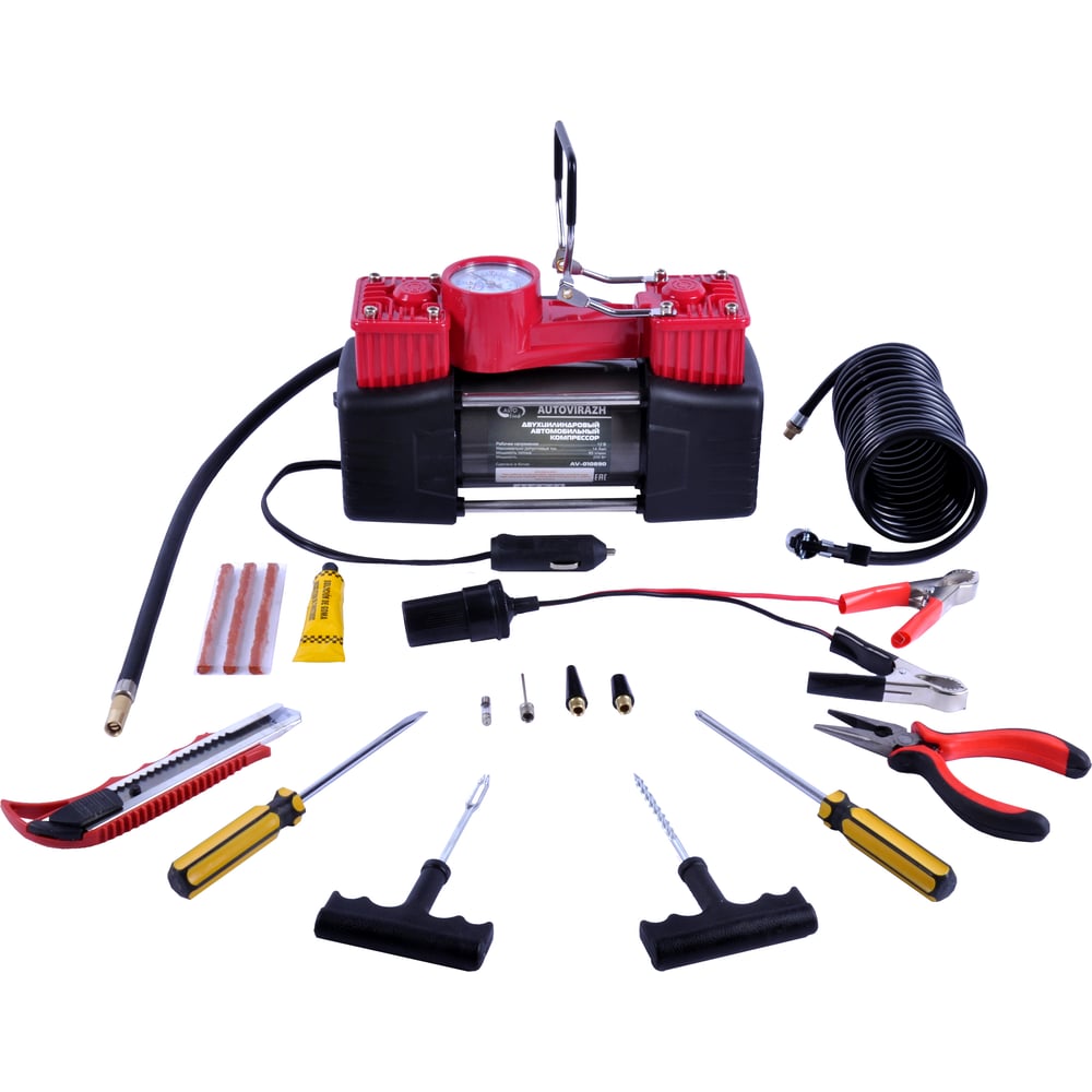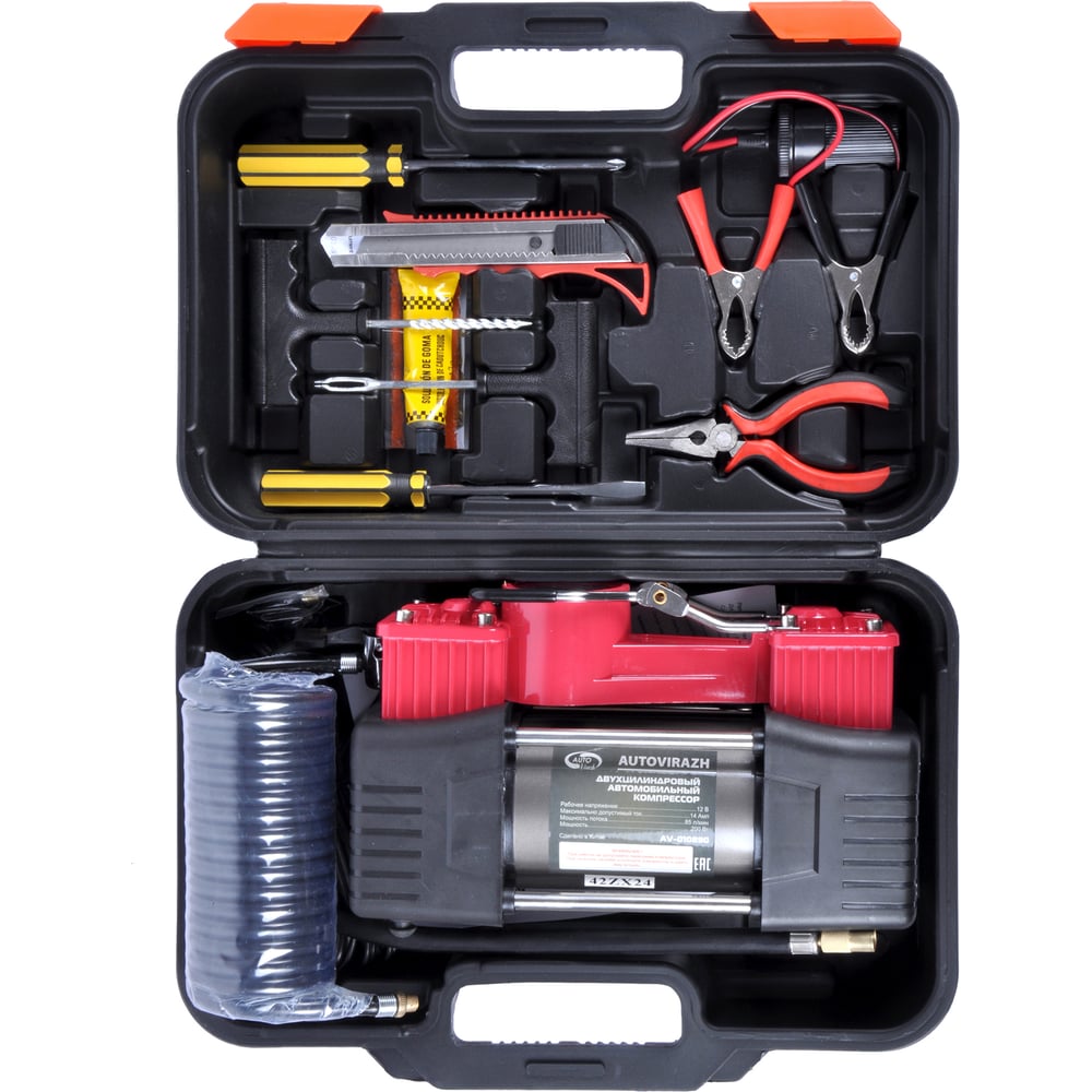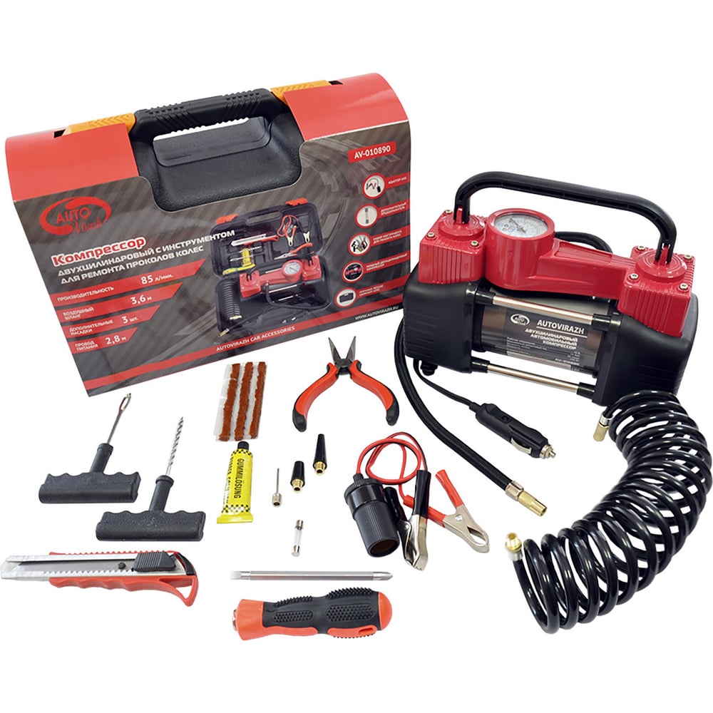 Двухцилиндровый компрессор 85 л/мин в кейсе с набором для ремонта колес AUTOVIRAZH AV-010890