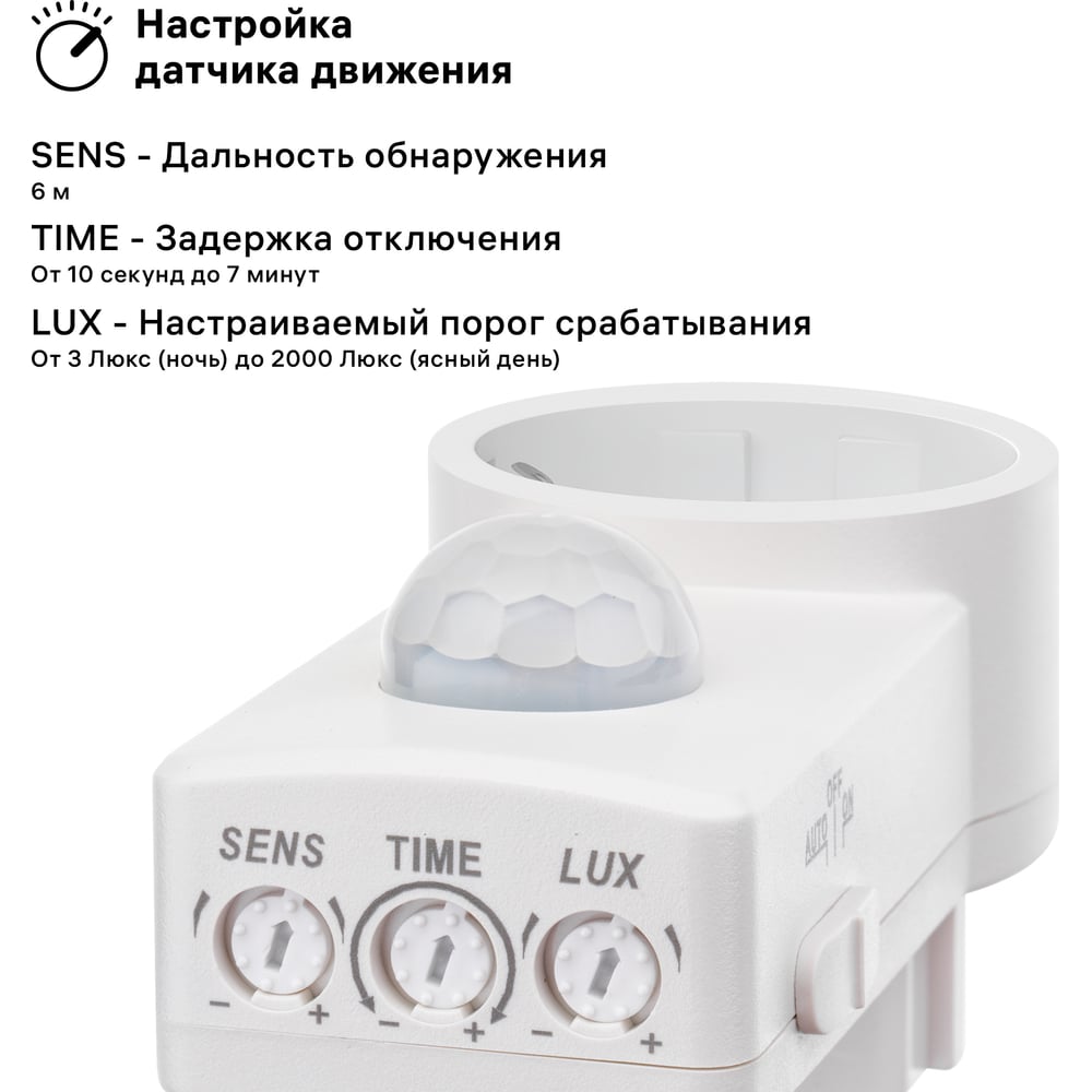 Датчик движения duwi интегрируемый, розеточный, DDSS-01, 180°, 10-420с, 6м, 1200Вт, IP20, белый, 25827 8