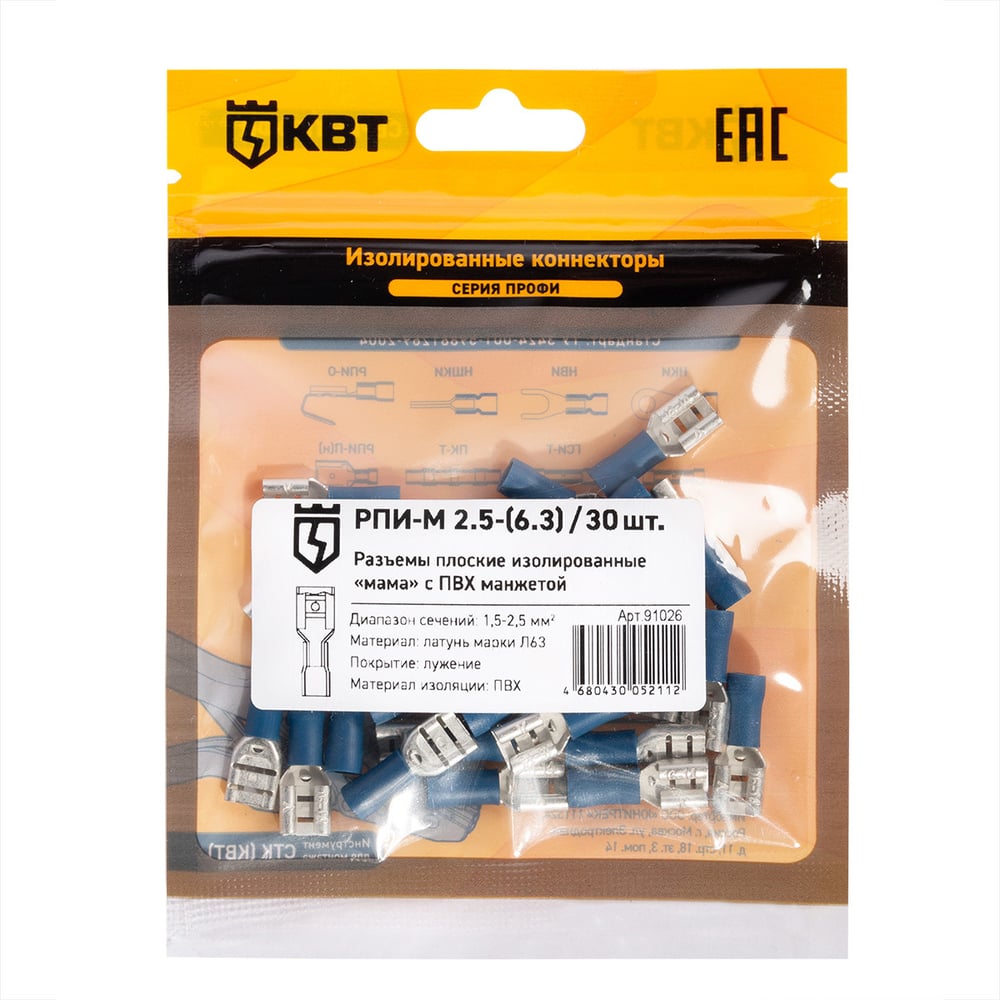 Плоский разъем КВТ РПИ-М 2,5-6,3 30шт. 91026