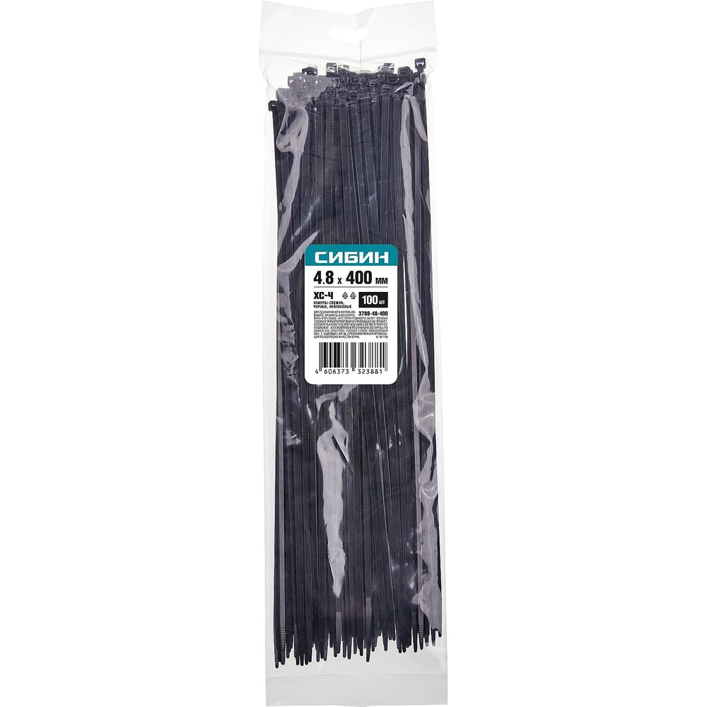 Хомуты-стяжки СИБИН ХС-Ч черные, 4.8х400 мм, 100 шт, нейлоновые, 3788-48-400