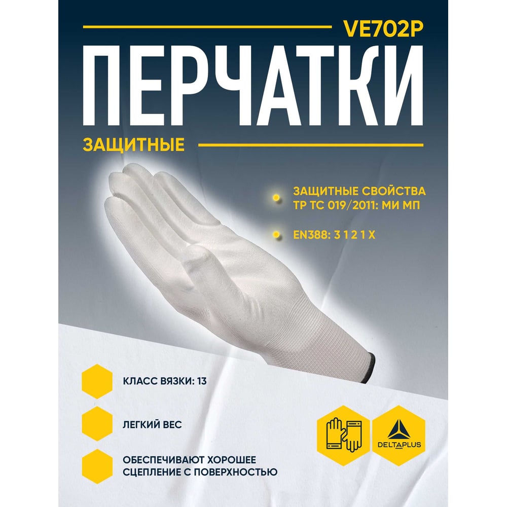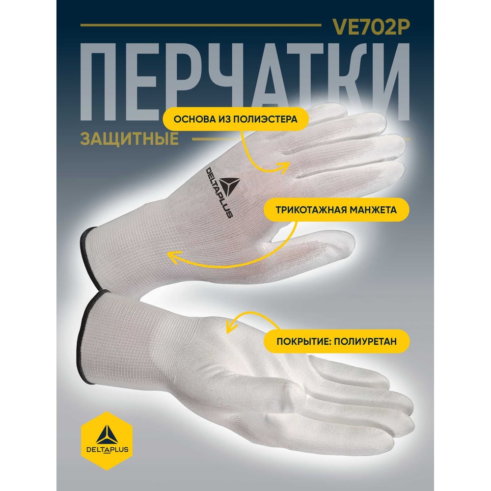 Полиэстеровые перчатки с полиуретановым покрытием Delta Plus цвет белый, р.7 VE702P07
