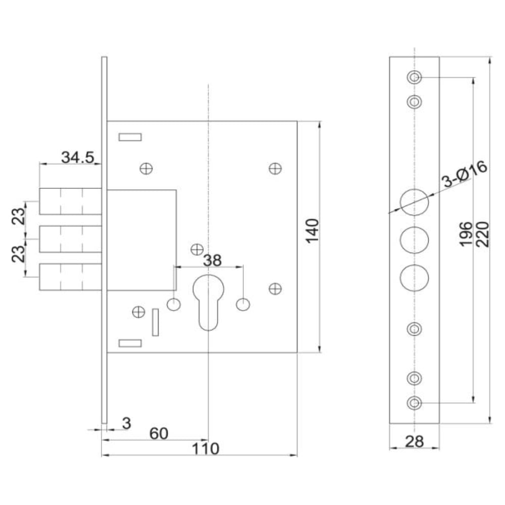 Корпус цилиндрового замка DOORLOCK DL9257С/60мм, хромиров. фронт. планка 28х220мм, реверсивный, диам. ригеля 16мм, OEM 75337