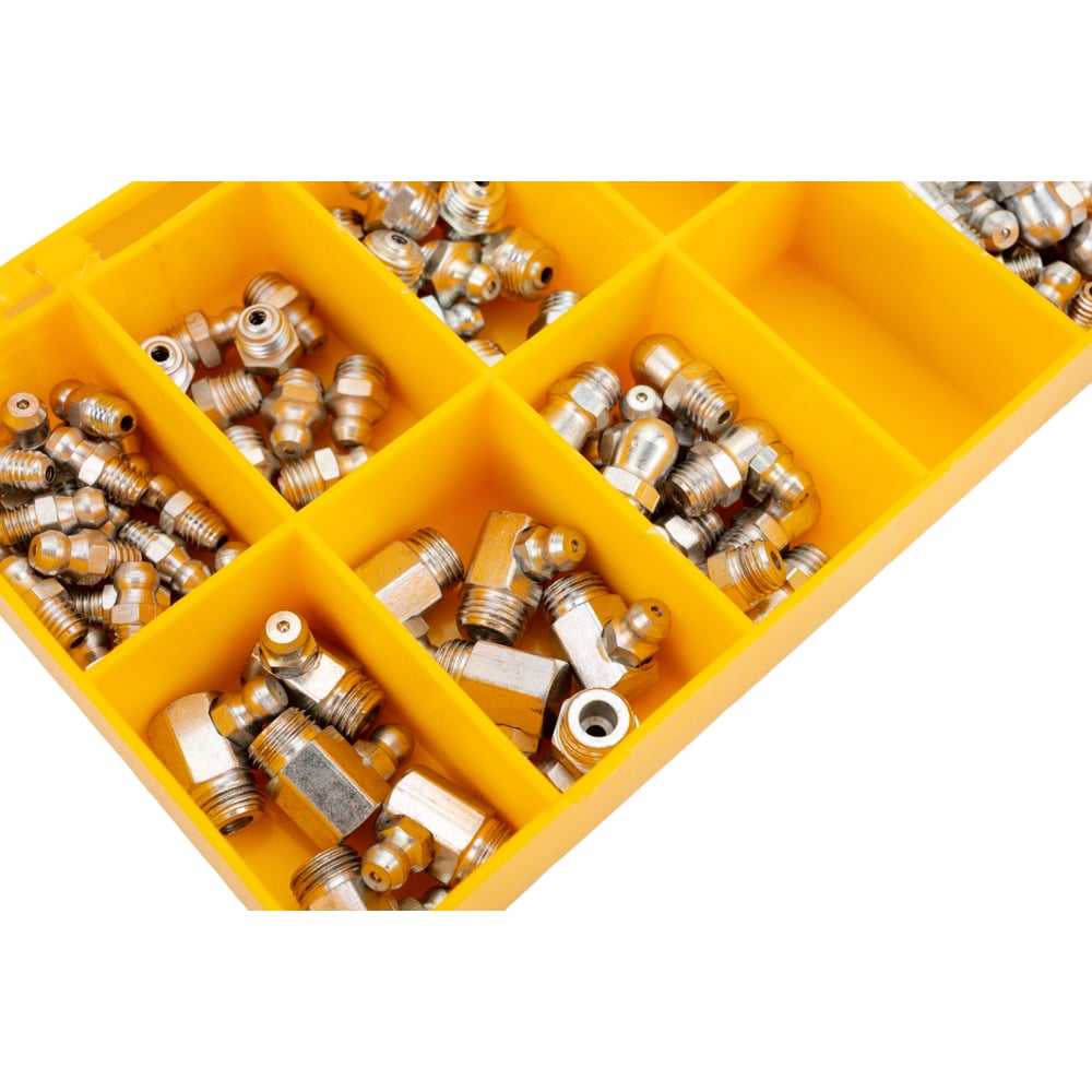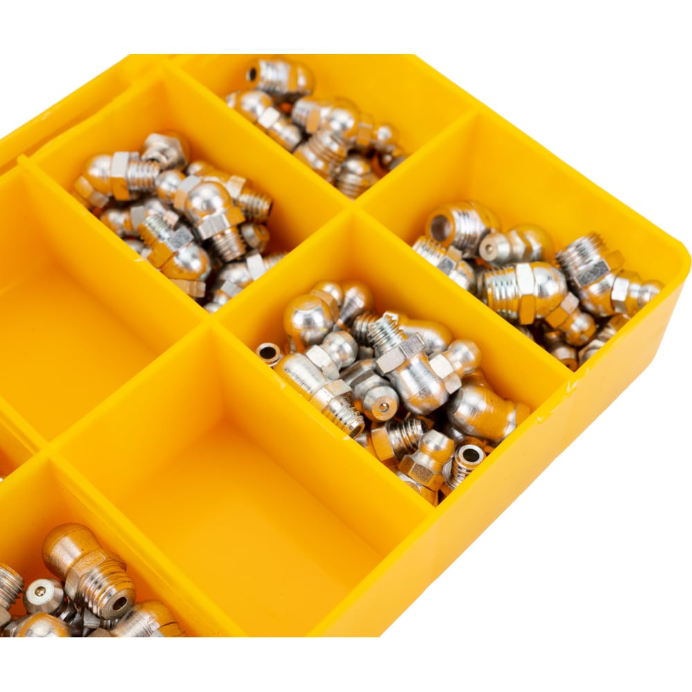 Комплект пресс-масленок в пластиковой коробке GROZ 110 шт М6 М8 М10 прямой 45 90 градусов GR43991